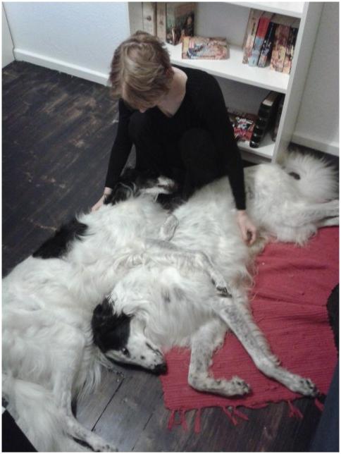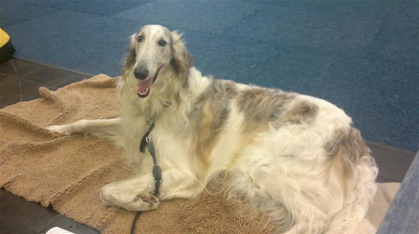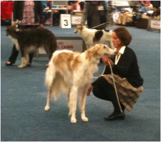 23.04.2012: wie, so fragen wir uns, soll Berendaij schönes, langes Fell bekommen, wenn er immer mit dem A..Rücken an der Heizung liegt ? How, so we us ask, Berendaij shall get beautiful, long hair, if he every time lies with his a... back on the radiator ? 21.04.2012:heute waren wir alle in Ostercappeln. Es war ein besonderes Highlight, dass die Barsois von einer russischen Richterin gerichtet wurden: Frau Deres. Für uns ist es interessant zu erfahren, wie unsere Hunde in ihrem Ursprungsland beurteilt werden. Wir hatten 4 Hunden gemeldet. Doch so wie wir dachten natürlich auch alle anderen und somit waren entsprechend viele Barsois am Start.