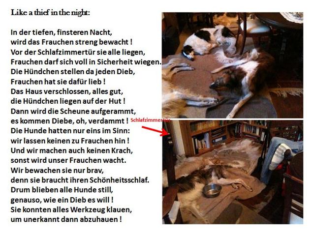 2012: ![]() 31.12.2012: die 2 "elben Äikener" feiern ausgiebig Silvester. Auch Karin feiert kräftig, wie auch Achim und viele andere mit ihnen! ![]() ![]() ![]() die mit den "Wolf(sjägern)" tanzen .... "was Du mir da erzählst, glaub` ich nicht ....." und einige Stunden danach: Spazieren und radeln ..... 27.12.2012: Weihnachten ist vorbei! Lange Gesichter bei den Barsois! Leider konnte der Weihnachtshund nicht alle Wünsche so erfüllen, wie sie es sich erhofft hatten, denn Achim war am 23.12. nach Hause gekommen und wußte nicht, dass der Kamin nicht an durfte! Somit sind viele schöne Träume verbrannt, z.B.: die Tickets für die Fernreisen, die Betten und schönen Klamotten. Die Torten sind geschmolzen und die Katzen haben sich mit Krallen und Zähnen gewehrt, durch den Schornstein geschoben zu werden. Der Weihnachtshund drohte uns schon mit Klage! 23.12.2012:alle 3 Asen am Bremer Flughafen warten auf Achim, der endlich aus Libyen zurück kommt. ![]() 20.12.2012: unsere Hunde liegen gemütlich an der Heizung und warten darauf, dass Frauchen endlich den Ofen und den Kamin anfeuert, damit sich wohlige Wärme im ganzen Haus verbreitet. Alle haben schon ihren Wunschzettel nach Nikolausdorf geschickt und ich bekam die strickte Anweisung, am 24. den Kamin nicht anzuzünden, weil der Weihnachtshund da sonst keine Geschenke bringen kann! Alle wünschen sich ein neues Bett, Schinken, Torten, Kauknochen, Kaupansen, eine Katze und Fernreisen! Bis auf Berendaij. Er ließ mich wissen: wenn alle auf Reise sind, werde ich sowieso mitgenommen, dafür kann ich mir ja besser was anderes wünschen! - cleveres Hündchen, der Beri ! Hier zwei Beispiele: