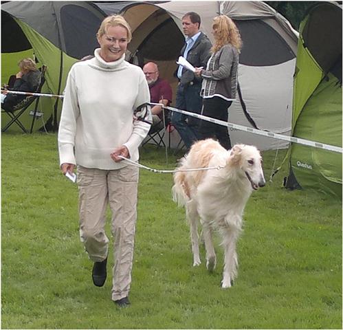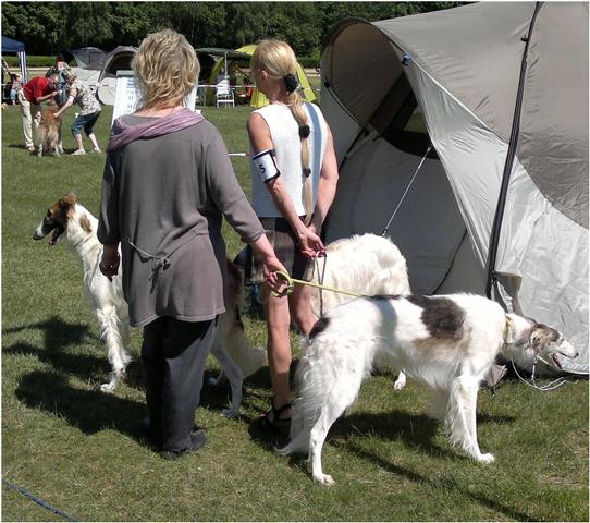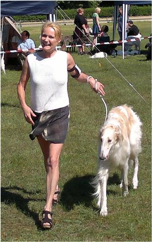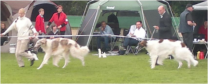 Today we all have been in Ostercappeln. It was a speciel highlight, that the borzois became judged for a russian Judge: Ms Deres. For us it is very interesting to learn how our dogs are beeing judged in there country of origin. So we have bayed 6 dogs. But like us naturally all the other once also thought and so there were proportionally many Borzois at the start. Berendaij today hat a bad day, er got very frightend in the ring, so we nearly toppled. He could not calm himself any more at all. Nevertheless for our kennel it was a very successful day: Berendaij got a V3 in the Junior Class, Niemen won the Intermediate Class with V1 and obtained into the toss against Nabat of the Oppen Class the VDH-CH-A and Res.-CAC. In The Open Class Ms Beres could not hardly decide between Maxim and Nabat: so Maxim got finaly V1, CAC and VDH-CH-A and Nabat V2 and Res.-VDH-CH-A. Michaela showed with Maxim, how good she can assert the dogs in the ring.