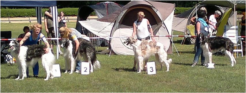 26.05.2012: wir waren alle in Gelsenkirchen ! Auf diese Ausstellung haben wir uns schon lange gefreut: die Leute sind freundlich, der Platz mit seinem Außenbereicht ist schön, es gibt immer etwas Leckeres zu essen und es sind immer ein paar Verkaufswagen da, wo man schöne Dinge für sich und die Hunde bekommt - und: man trifft viele nette Mitaussteller ! Auch Achim, mein Mann, war mit, besser ging es nicht ! Doch auch so ein Tag ist immer für Überraschungen gut: Bohdana wollte nicht aufstehen ! Sie hatte wohl so gut auf Idefix Bett geschlafen und das wollte sie so lange auskosten wie möglich ! Half ihr aber nicht: sie mußte mit! Vielleicht war das auch Taktik, denn so wurde sie von Achim auf den Arm getragen. Als wir angekommen waren und die Unterlagen holten, sahen wir mit Entsetzen: Bohdana war in der Jugendklasse der Rüden eingeteilt. Doch da zeigt sich die Freundlichkeit: kein Problem ! Es waren sehr viele Barsois gemeldet, denn Gelsenkirchen ist nicht nur bei uns so beliebt, doch das heißt auch: langes Warten in der Sonne ! Und da Herr Langer eine Richteranwärterin hatte: noch längeres Warten, da er viel erklären mußte. Für Bohdana war es ein richtiger Kulturschock: so viele Hunde und Menschen, Jubel, Trubel, Lärm und Gerüche ! Dann das kontrollierte Laufen und Stehen im Ring, mit einem eher fremden Frauchen. Doch sie meisterte alles. Aber als wir mit Richten durch waren, da konnten wir alle nach Herzenslust ( und Geldbeutel ) shoppen, ( fr )essen und genießen ! We all have been in Gelsenkirchen ! Long time we looked forward to this show: people are kindly, the place with the surrounding is beautiful, everytime is gives something delicious to eat and ther are always some push carts, where you can bay fine things for you and the dogs - and: you meet many kind exhibitors ! Also Achim, my husband, was with us, better it couldn `t. But also such a day springed a surprise: Bohdana didn`t want to stand up ! It meeded she had sleep so well in Idefix bed and she liked to enjoy it to the fullest ! But it did no good to do, she must with us ! Maybe it was generalship, cause Achim carryed her in his arms. When we arrived and looked into the catalog, we saw with horror: Bohdana was scaled into the male Youth Class. There it shows the kindnes: no problem ! There were many borzois signed, cause Gelsenkirchen is not only popular by us, but that meens: longe time waiting in the sun ! And cause Mr. Langer had a judge-aspirants, a little bit more longer waiting, for he must exclaim much. For Bohdana it was a real culture shock: so many dogs and people, rejoicings, embraces, noise odors ! Than the controlled running and standing in the ring, with a druther new mistress. Nevertheless she mastered all. But when we were ready with judging, we could shopping to our`s heart`s content ( and monybag ) , eating and indulge in the day ! ![]()