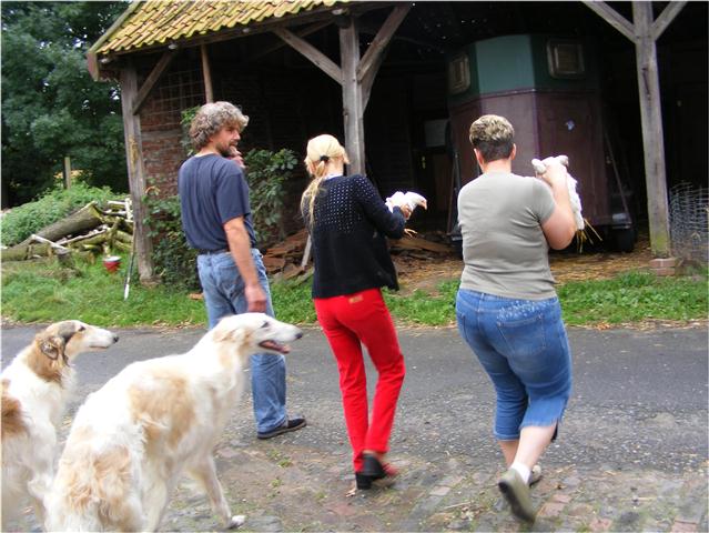 02.08.2012: Lentey hat eine neues Zuhause gefunden. Ganz unerwartet nahm er den Platz seines Bruders Lew ein, der sich bei uns am Hals verletzte. Welch Glück für ihn und Trauer für uns, doch wir sind immer froh, wenn es unseren Hunden gut geht. Hier das erste Foto von Lentey mit seinem neuen Frauchen, das ihn sehr liebt, und wir fragen uns: wer ist schöner ? Die Antwort ist einfach: Frauchen ! Wenn aber Lentey sich in Position schmeißt, dann sehen beide toll aus! Lentey has found a new home ! He switched with his brother Lew, how sustained a trauma. Here the first picture with his new owner. Our question was: who looks more stunning. But the answer is simple: mistress. But if Lentey postures, both look stunning ! ![]() 02.08.2012: Katai ist wieder - leider unverrichteter Dinge - zu Hause. Neweßta möchte lieber noch warten ...... Katai is back, Neweßta likes to wait a little more..... 01.08.2012: wir haben uns entschlossen, ein neues Zuchtziel zu verfolgen ! Wir versprechen uns davor eine wesendlich verbesserte Jagdtauglichkeit und sind überzeugt, damit jedes Coursing zu gewinnen. We have a new objective of breeding and we are sure to have much better fitness for hunting and we think to win all coursings. ![]() 14.07.2012: heute waren wir in Münster ! Da es sehr viel geregnet hatte, waren der Platz und das Umfeld sehr naß. Aber wir hatten persönlich sehr viel Glück mit dem Wetter: es begann erst wieder in Strömen zu regnen, als die Barsois gerichtet waren. Viele nette Leute trafen wir und hatten somit auch viel Spaß. Der schwedische Richter, Herr Adeheimer, war sehr freundlich und ich habe mich sehr wohl gefühlt. Auch hatte er einen ausgesprochenen Sinn für Humor. Wir sind sehr glücklich über Niemens V1 und auch zufrieden mit Maxims V3. Wir freuen uns mit Frau Gerda Altner und Walter Plante über ihren Erfolg und auch mit allen anderen Gewinnern und Platzierten ! Immerhin war Münster mein erster Rennverein ! Das waren noch Zeiten ! today we have been in Münster ! The place and area arround was very wet, cause it was raining a lot in the past. But we had luck with the weather: when Borzois were under judgement, rain started again. We meet many kindly people and so we had much fun. The swedish judge, Mr. Adeheimer, was very kindly and I feel well. Also he was full of humor. We are lucky about Niemens V1 and Maxims V3. Together with Mrs. Gerda Altner and Walter Plante we were very happy about her success. And as well with all the other winners. By the way, Münster was my first racing-club ! I remember good old times ! ![]() ![]() ![]() 10./11.07.2012: uns interessierte die Fragen bezüglich der Möglichkeit der Nachmeldungen. Freundlicherweise teilte mir der DWZRV mit, dass das nicht geht. Der VDH hat ausweichend geantwortet, da werden die Meldezeiten bei Bedarf offiziell verlängert. 07.07.2012: Junghundeschow in Hünxe, Schwarzensteiner Weg: die Barsois zu elben Äiken grüßen die Cappenberger Meute ! Hier werden keine Windhunde, sondern die Junghunde ( Beagel, Foxhounds, Harrier, Black and Tan usw ) der verschiedensten Deutschen Schleppjagdmeuten vorgestellt. Auch ich war dabei, unsere Junghunde der Cappenberger Meute vorzustellen. 2 englische Richter bewerteten die Hunde. Diese Vorstellung ist nicht mit unseren Hundeausstellungen zu vergleichen. Aber einen guten Schluck gab es trotzdem ! Hier ein paar Impressionen. show for joung dogs in Hünxe, Schwarzensteiner Weg: it is not for sighthounds, but for joung dogs from the different german foxhunting packs of hounds. I am member of the Cappenberger Meute and was helping. 2 english judges were invited to assess the dogs. These show does not compare to our dog shows. Here a few impressions. ![]() ![]() 05.07.2012: nett von Dir, wenn Du mir mit Abschlecken das Fensterputzen abnehmen willst ! Very kind, that You will help me to clean the window with Your tongue ! 04.07.2012: so geduldig läßt Volia sich "bearbeiten !" Das Ohr ist dran geblieben ! Eine liebe Hündin! Volia and the Collie-puppies: Volia endures so tolerantly ! Her ear is still on place !
