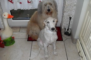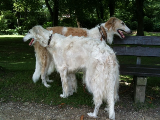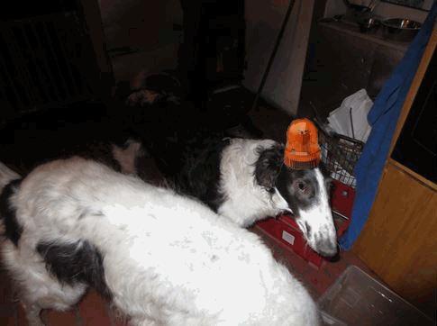 14.05.2014: Ich habe lange überlegt, was Nabat will. Und er scheint nicht gerne auf Ausstellungen zu gehen, obwohl er sehr erfolgreicht ist und war. Es ist einfach nicht sein Ding: er will lieber laufen, schnell, doch nicht im Kreis. Ich will seine Meinung respektieren! Zumindest jetzt! Solange er von uns durch den "Ring" gezogen werden muß, weil er "null Bock" hat, braucht er nicht mehr ausgestellt werden. Sobald er signalisiert, gerne ausgestellt zu werden,ist er selbstverständlich wieder dabei! Dabei ist er ein echter "Hingucker", wie man ihm auf vielen Veranstaltungen testiert hat. Schade, dass er so lustlos bei Ausstellungen ist, vor allem, wenn man ihn sieht, wie angagiert er mit Achim "Fahrrad" fährt!!! Dann flippt er förmlich aus! Doch wir respektieren den Wunsch und Willen unserer Hunde. 13.05.2014: Es ist immer wieder toll zu sehen, wie sozial Niemen ist! In "unterwürfiger" Position, also als ranghöherer Rüde liegend, fordert er Opal zum Spiel auf! Er ist sein Vorbild und Mentor! Welch ein Hund! Ich liebe ihn sehr! 10.06.2014: Ein Tag zwischen Himmel und Hölle! Mit dem Pferdeanhänger im Schlepptau, einem nicht 100%ig laufenden Auto, einem kranken, eher nicht gut gelauntem Mann und 3 lustlosen Barsois nach Dortmund! Ach ja, und es regnete! Am Ring: kein Platz mehr, also: alle rücken zusammen ( schön ). Wir sind mit Opal in der Jugendklasse als erster dran, und: gewinnen! Dann Maxim in der Championklasse: Und wir gewinnen die Siegerklasse! Jetzt ist Maxim Doppelchampion!!!! Dann Nabat in der offenen Klasse: Nein, wir gewinnen nicht, doch wir werden V3-platziert. Dann Jugend-BOB und zusätzlich der Titel Frühjahrssieger! Rückfahrt: Die Hunde kauen Ohren, wir sich auch froh! Opal bellt, muß pieseln ( ? ), wir suchen den nächsten Parkplatz auf, halten, Opal raus, es beginnt zu regnen, Opal will nicht! Weiter! Dann: Tanken! Wieder runter! Kaum wieder in Fahrt: Polizei! Und ich habe ja keine Papiere mehr, doch die Anzeige bei mir! Dauerte etwas, sehr freundliche Polizisten, alles war i. O., weiter! Dann: Was essen wir heute Abend? Burger? Also: Das 4. mal runter von der Bahn! Dann gehts weiter. Opal bellt, muß immer noch pieseln ( ? )! Jetzt wird aber durchgefahren, vera..... können wir uns selber! Zu Hause angekommen: Alles ist gut! Das Auto hat es auch geschafft! Unser guter, alter "Shire"! ![]()