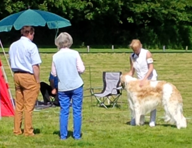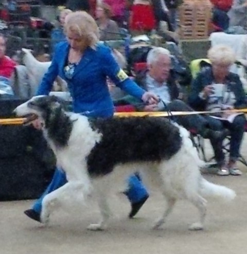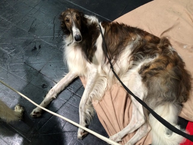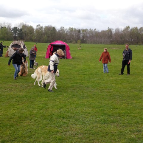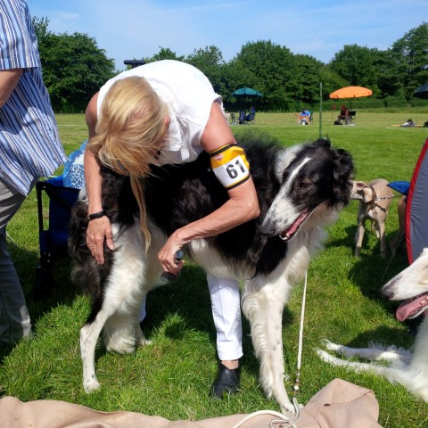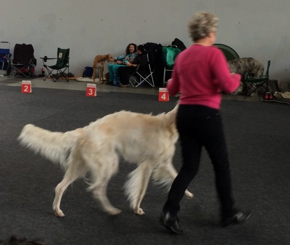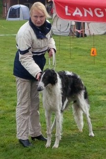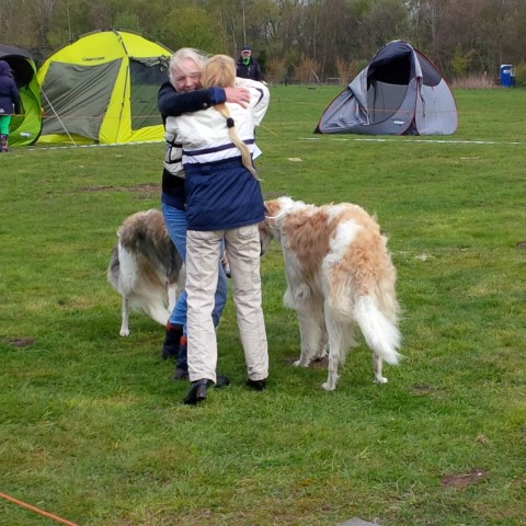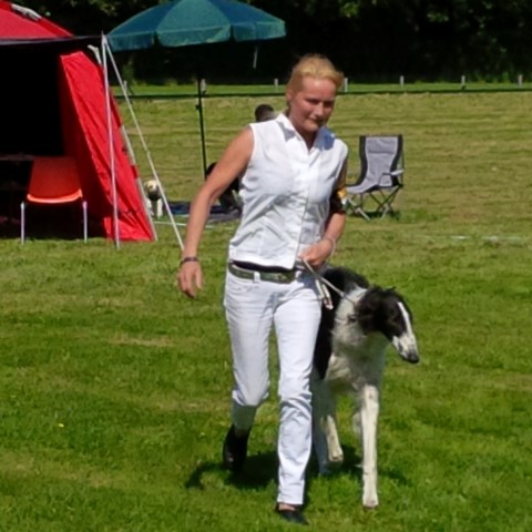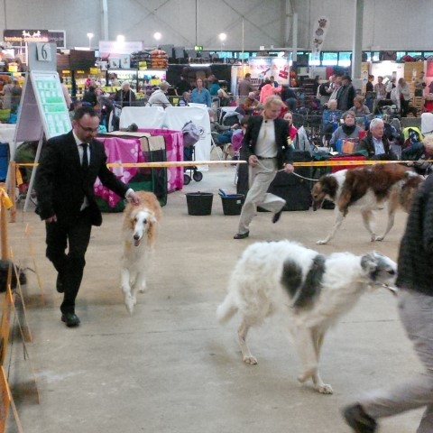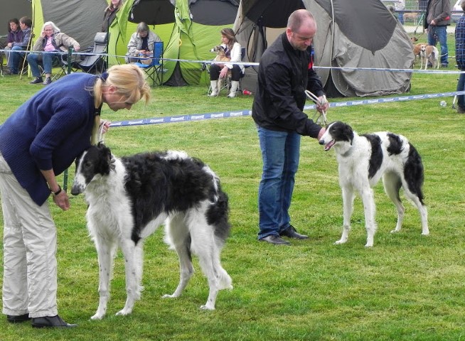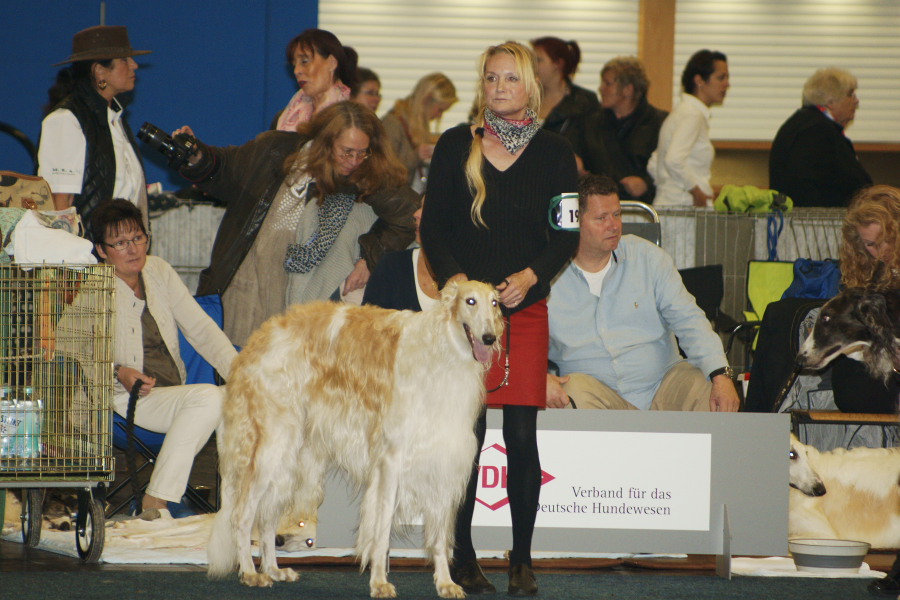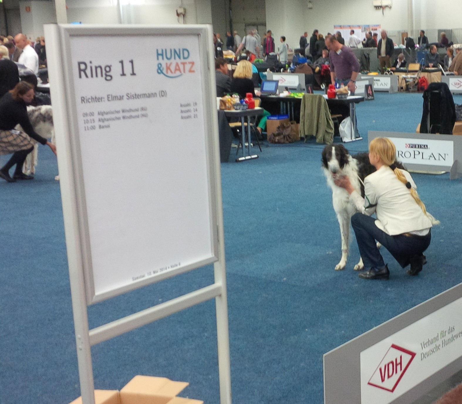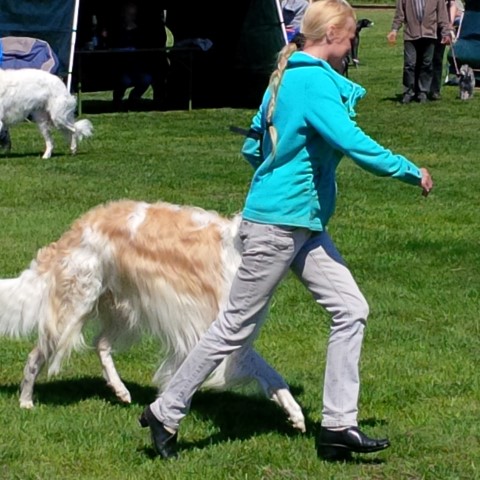 27.04.2014: Lingen! Eigentlich eine schöne Veranstaltung! Heute jedoch die 2. an einem Wochenende! Ich hatte es beim Melden nicht gerafft!Jetzt hatte ich das Problem! Und dann mit 2 Rüden, die O-Bock auf Ausstellungen haben! Ich hatte sie beide in der offenen Klasse gemeldet, dennoch war Maxim in die Championklasse gestellt worden. Nun gut! Wir hatten extem gute Mitbewerber: u. a. Frau Gielisse und Herrn Kuszyk, beide internationale Richter und Barsoizüchter! Mit beiden haben wir viel Spaß gehabt und wir haben uns austauschen können, was für mich immer einen extra Lerneffekt hat. Das alles war sehr schön, auch war schön, Claudia und Joyce wieder zu treffen. Maxim hat einen 3. Platz gemacht, einen sehr tollen Richterbericht bekommen, der zur Bewertung gar nicht passt, Nabat hat auch einen sehr tollen Richterbericht bekommen: V2, doch, wie gesagt: starke Mitbewerber! Nur das macht es ja interessant.