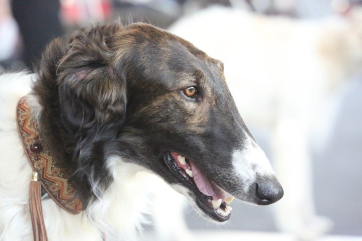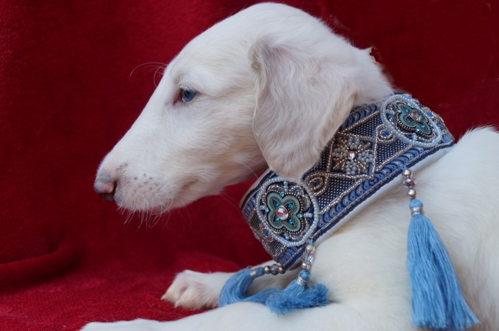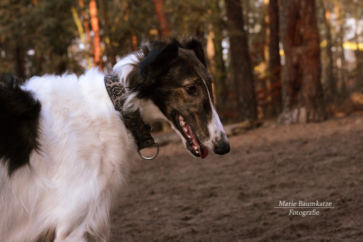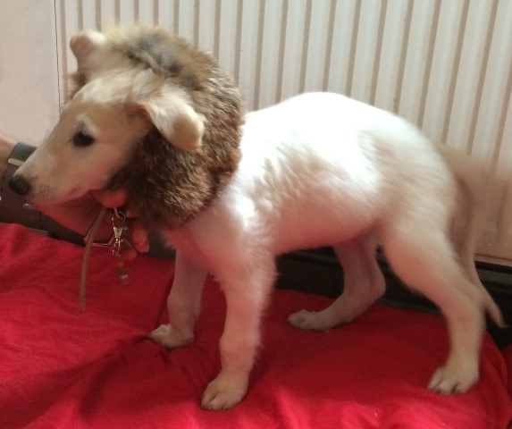 ![]() ![]() Wir fahren mit unserem "Lastwagen" langsam, ganz langsam gen Hannover, und das über die Dörfer! Aber wir kommen pünktlich, wenn auch etwas genervt, an. Bei der Rassevorstellung des VDH durfte ich mit Opal die Rasse Barsoi vorstellen. Opal war, wie üblich, am meisten genervt, er hasst Hallenausstellungen. Doch er stellte sich besser vor als in Dortmund und ging glücklich mit dem Jugend-BOB nach Hause. Auch Niemen gewann seine Klasse und Berendaij wurde in einer großen offenen Klasse dritter hinter Borzowski`s Phenomenon ( S ), der schon internationaler-, Dänischer-, Englischer-,Finnischer-,Norwegischer- und Schwedischer Champion ist und Richter A. van den Broek. Da es eine zahlenmäßig große Klasse war, wurde sie in zwei Gruppen aufgeteilt und ich freue mich sehr über die V3-Platzierung! 31.10.2014: Alpha-Macawi probiert schon mal seine zukünftigen Halsbänder aus: