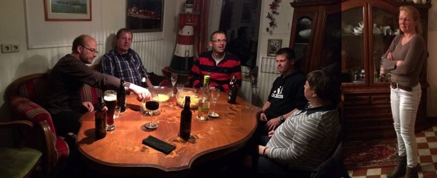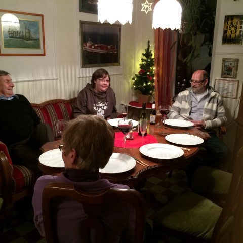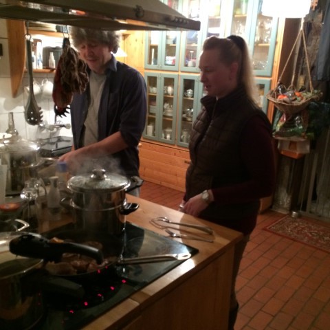 24.12.2014: Karin und ich hatten alle Weihnachtseinkäufe erledigt. Jetzt war bei uns noch der übliche Hausputz angesagt und natürlich die Essenvorbereitungen: Der Fisch wurde geputzt, die Lendchen geschnitten und die Ente mußte gewürzt werden, sie lag auf der Anrichte, ja, sie lag! Denn aktuell wurde sie vor einigen "Terroristen" in der Scheune zerrissen und gefressen! Oh!!! Weihnachtsbraten adé! Satte Terroristen, der Baum geschmückt, die "Köche" bei der Arbeit, die Gäste am Tisch warten auf den Braten.