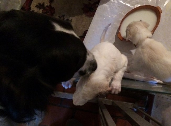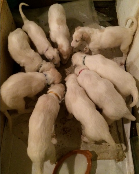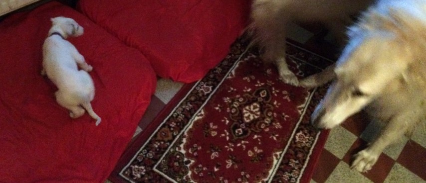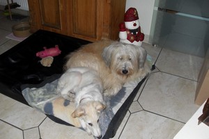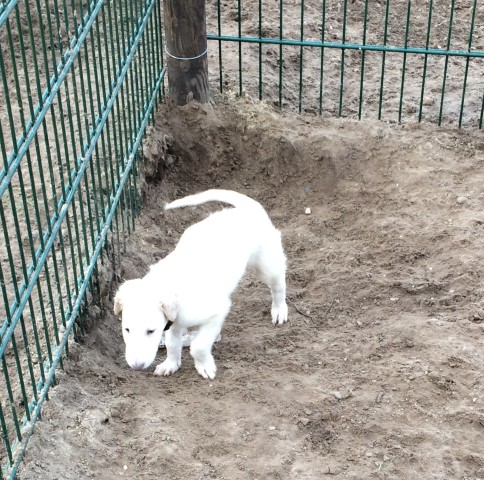 05.12.2014: Der arme Opal hat es mit dieser Rasselbande wirklich nicht leicht! Er ist der einzige, der sich riesig um sie kümmert! High und die anderen gehen ihnen inzwischen lieber schnell aus dem Weg! Aber Opal liebt sie über alles!!! Noch sind es 5, die er beaufsichtigt, morgen werden wieder einige abgeholt! Leider mußte ein neues Hundefrauchen - krankheitsbedingt - ihren süßen Welpen wieder zurückgeben. So ist noch ein weißer Rüde zu haben. Wir hoffen sehr, dass auch er ein schönes neues Zuhause findet. Inzwischen weiß ich aber, dass Milow sich sehr gut mit seinen 2 Katzen versteht! 01.12.2014: Neue Bilder von Aron, der jetzt Milow gerufen wird: ![]() ![]() ![]() Milow hat ein großes bett, einen großen Garten und hat unterschiedliche Spielgefährten: Hunde und Katzen. Frauchen, Herrchen und die Hunde freuen sich, dass er da ist, ob die Katzen es auch tun, weiß ich nicht...