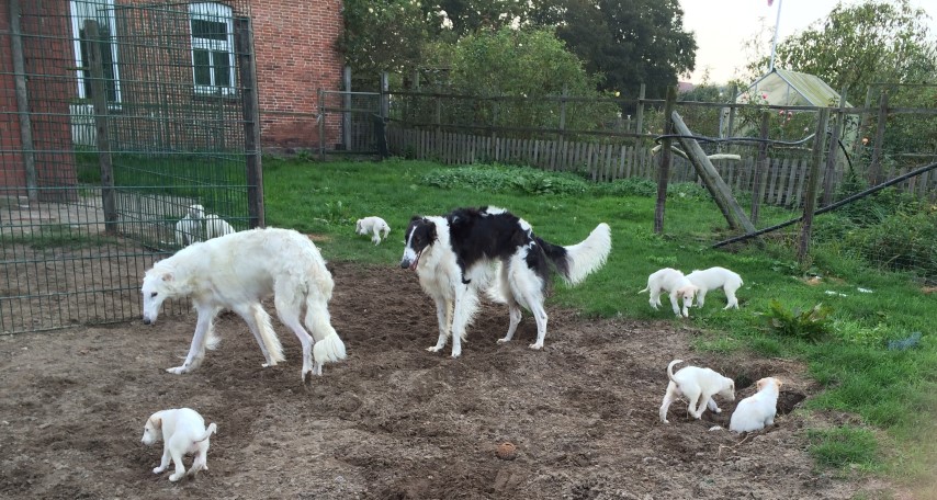 Jeder bekam einen halben Napf voll! Amethyst räumt gut auf! Aurora war auch bald fertig damit, ursprünglich waren Welpen und die Waschdecke mal weiß, die weiteren Bilder sparte ich mir! 27.09.2014: Gelsenkirchen ist angesagt, morgens um 06:00 Uhr ging es los! Bis Dülmen kam ich normal, dann setzte die "Motorsteuerung" ein: 80 KM/H! Dennoch ich war vor 08:00 Uhr da, doch auf dem "normalen" Platz war kein Parkplatz mehr zu bekommen: Alles voll mit Wohnmobilenund Wohnwagen! Auch war bald der "Auslaufplatz" voll mit PKWs! So voll habe ich es da noch nie erlebt. Viele nette Leute waren da, ich war froh, dass auch Frank und Christoph, Johanna und Kristian da waren. Es waren viele Barsois gemeldet, und so war ich sehr glücklich, dass Odaloij sein 2. Jugend-CAC bekommen hat. Auch Niemen hat sein V1 in der Siegerklasse mit nach Hause genommen, aber das war es auch schon, Herr v. d. Broek hat alle Male-Titel bekommen! Trotzdem ist meine Freunde ungetübt! Denn Odaloij`s CAC war mir wichtig! Nach dem Ehrenring zuckelte ich wieder mit 80 nach Hause, alle LKWs überholten mich. Doch dann, nach einer kurzen Pause, lief der alte "Shire" wieder richtig! Ich überholte freudig alle LKWs und brauste Richtung Dinklage! Genau vor der Abfahrt schaltete er wieder auf "Motorsteuerung"! Zumindest hat er mich nicht mehr blamiert! Ein langer Tag! Karin passte auf die Welpen auf, alles war gut! Alle sind wir müde und werden wohl gut schlafen! 24.09.2014: Heute wurde die Wurfbesichtigung, die innerhalb von 3 Wochen vorgenommen werden muß, da es ja über 8 Welpen sind, durchgeführt: Alles sehr o.K.! Das tierärztliche Attest war auch super: Mutter und Welpen in sehr guten Zustand! Was möchte man als Züchter mehr!?! 22.09.2014: Unsere Kleinen sind sehr frühreif! Sie klettern schon aus der Wurfkisten und ärgern damit ihre Mama, die sich gerne mal zurückzieht! Man sieht es wohl nicht so gut, aber einige liegen schon bei Muttern an der Milchbar, die das natürlich nicht so prickelnd findet! 15.09.2014: Das schrieb ich gestern Abend ( s. u. ). Doch dann fiel mir ein, dass momentan in der "Barsoi-Szene" von einigen "Barsoi-Liebhabern" nicht mehr unterschieden werden kann, was scherzhaft gemeint ist, wie z.B. unsere ursprüngliche, jetzt aus eben diesen Gründen geänderte Aussage zur nächsten Wurfplanung. Deshalb möchte ich das unten geschriebene doch noch einmal erklären: Ja, ich engagiere mich für den Tierschutz! Das tue ich gerne und mit viel Eifer. Zum andern bin ich auch für andere Veranstaltungen schon gebeten worden, die Rasse Barsoi der Öffentlichkeit vorzustellen. Für mich ist dabei sehr wichtig, dass die Hunde artgerecht gehalten werden; das bedeutet für mich nicht, dass sie auf Sofa und Bett gehalten werden müssen oder dass man sie vermenschlicht, sondern dass sie viel Zuwendung und Liebe bekommen und vor allen Dingen die Möglichkeit haben, sich ausreichend zu bewegen. Denn sie sind Jagd- und Hetzhunde, auch, wenn sie sich im Haus oder in der Wohnung gern wie ein dekorativer Teppich verhalten. Und nein, meine Barsois sind nicht im Tierheim gelandet, sondern waren nur mit, um die Rasse vorzustellen! Heute liegen sie alle wieder im Haus hinterm Ofen und freuen sich, es so gut zu haben! 14.09.2014: Das Tierheim Sedelsberg läd ein zum "Tag der offenen Tür". "Offene Tür?" fragten sich unsere Barsois, "das soll wohl ein schlechter Scherz sein! Wir sind hier hinter Gittern! "