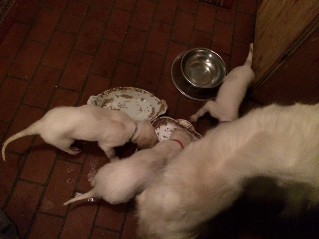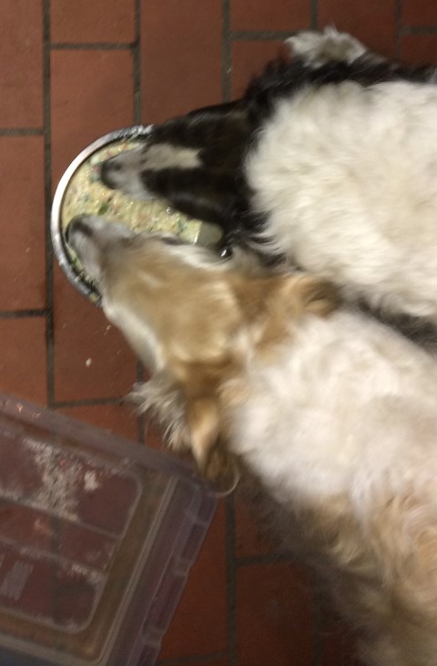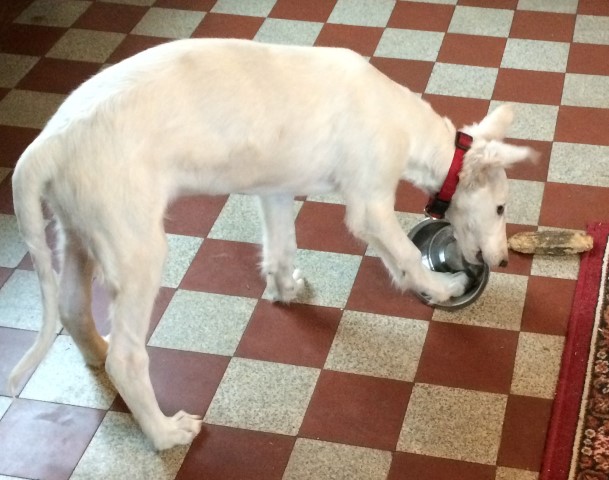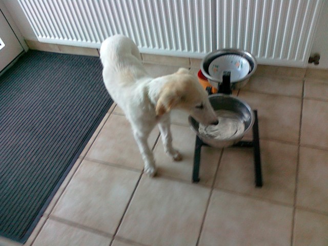 Wir wurden gebeten, die Rasse Barsoi dort einmal vorzustellen. Es waren viele interessierte und spendable Menschen da, und viele davon haben einen Barsoi in Natura noch nie gesehen. Ich führte eine Menge interessanter Gespräche und mußte viele Fragen beantworten. Hauptziel dieser Aktion war neben den Spenden auch, die Hunde und Katzen zu vermitteln. So kam ganz zielstrebig ein Mädchen mit ihren Eltern auf das Freigehege, in dem Maxim, Nabat, Niemen und Berendaij vorübergehend untergebracht waren, zugerannt und rief: Schei.., den ( Niemen ) will ich haben! 11.09.2014: So artig essen unsere Rüden aus einem Napf: Niemen und Opal! 08.09.2014: Opal bekam ein neues Futter: Anifit! Das haben ja auch Maxim, Niemen und Berendaij schon probiert und weil es ihnen so gut geschmeckt hat, habe ich es bestellt. Er konnte gar nicht genug davon bekommen und holte sich sogar die Dose wieder aus dem Müll, um sie gründlich auszulecken!
