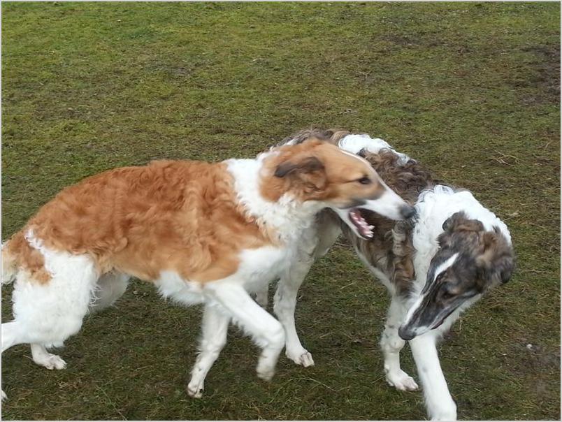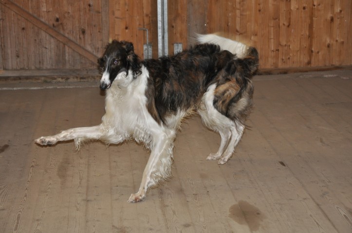 12.04.2014: "Im Nebel ruhet noch die Welt, ........... ": Volkmarsen! Doch dann kam die Sonne und es wurde sehr schön! Allein mit 4 Barsois, das war schon eine Herausforderung! Doch Christoph und Frank waren auch bald da. Opal war als erster dran, doch er hatte starke Mitbewerber, vor allem beim BOB und später auch beim "Best in Show", da waren neben ihm 6 schöne Windhunde anderer Rassen. Niemen hätte noch die Krallen geschnitten bekommen müssen, so knapp war die Entscheidung zu V1, Maxim hätte auch ein wenig mehr zeigen können, doch den Vogel schoß Nabat ab!!! An ihm gab es nichts zu bemängeln, außer: völlig lustlos!!! So steht es auch im Richterbericht! Ich mußte unseren Sportler förmich um den Ring ziehen. Hätte ich ein Fahrrad gehabt, sähe das völlig anders aus. Doch das hat ihm definitiv den vorderen Platz gekostet! Da er sich jetzt schon das 2. Mal so gegen das Ausstellen wehrte, werde ich es ihm auch nicht weiter zumuten! Er ist auch so ein toller Hund, der in vielen Ausstellungen seine Qualität schon bewiesen hat. Wenn es geht, werde ich mit ihm auf Coursing gehen. 11.04.2014: Neue Fotos von Oleg, er spielt gerne mit seinen Freunden und ist glücklich: