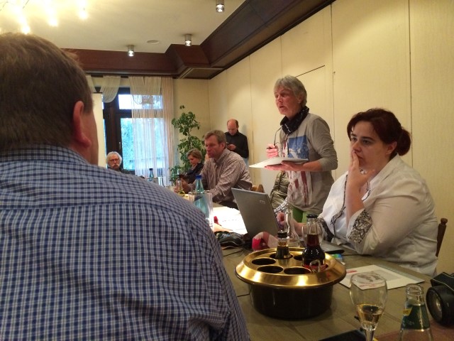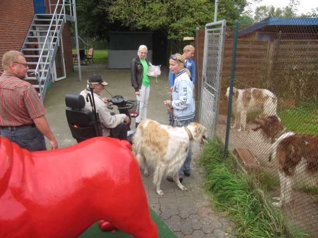 18.10.2014: Internationale Ausstellung in Dortmund, sonst immer eine Veranstaltung, auf der unsere Hunde sich von ihren besten Seiten zeigten. Niemen tat das auch, doch er ist eindeutig immer noch zu dick und ich bekomme bei ihm nichts runter! Es gibt ja auch Menschen, die sagen: Ich brauche das Essen nur ansehen, dann nehme ich schon zu! Bei Niemen scheint es seit einiger Zeit auch so zu sein, obwohl er sei geraumer Zeit auf Diät lebt - zu seinem Leidwesen. Dabei zeigt er sich noch durchaus sportlich, doch: Wie sieht das aus! Er hat ein exzellentes Exterieur, doch er wirkt wie ein "Fettnapf auf Gehwarzen", und das, seit er die High gedeckt hat. Sollte er jetzt wirklich zu einem bequemen Familienvater mutieren, abends mit seinem "Bierchen" bei der Sportschau auf dem Sofa? Ich hoffe, das ändert sich, wenn die Kinder aus dem Haus sind! Hingegen war es nicht Opal`s Tag oder besser, er wollte nicht, dass es sein Tag wurde! Er klebte an Niemen, war dadurch nicht ausstellbar, und ich war froh, dass er überhaupt platziert wurde! Er war der jüngste und kleinste Junghund im Ring und - im krassen Gegensatz zu Niemen - rappeldürr. Doch er ist auch unermüdlich, zusammenmit High, mit der "Erziehung" der Welpen beschäftigt. Egal, es war nicht unser Tag, dafür freuen sich die Gewinner der Show und ich mich mit ihnen. Warten mit Opal und Niemen, aber der Herr Jakkel hatte gar keinen Blick für die beiden! 15.10.2014: Geburtstag bei uns zu Haus: ![]() ![]() Achim, lass das "Knipsen"! Danke, Saskia, für das Bild! Jessika, Achim, Christian, Johann, Irene und unsere Eltern, Udo, Ludger, Jaimie, Joachim und Elisabeth, Anne. 14.10.2014: Nachdem High ihre/unsere Welpen ja nicht mehr säugt, hat sie heute mit dem "Füttern" begonnen! Ohje! Ich habe mich richtig erschrocken! Natürlich kenne ich das noch von Sabava, doch viele Hündinnen machen das schon gar nicht mehr, so war ich auch nicht darauf gefasst, weil High das zuvor auch nicht gemacht hatte. Unsere Hunde bekommen immer zusätzlich frisches "Rinderallerlei" ( Herz-Pansen-Restabfälle schön gekuttert von unserem Metzger). Da ich gerade das Welpenhaus säuberte, sprang sie rein und spuckte alles Gefressene aus. Die Welpen stürzten sich darauf und fraßen wie nie! Da das ja nicht genug für alle war, habe ich ihnen dann eine ausreichende Portion angerichtet, die auch in Null-Komma-nichts verschlungen war. Natürlich bekam High noch eine weitere Portion - nur für sich! 12.10.2014: Nach der Wurmkur, der Pediküre und dem Fotoshooting geht`s nach draußen: Spielen!