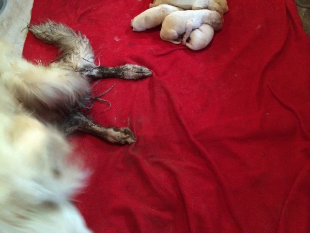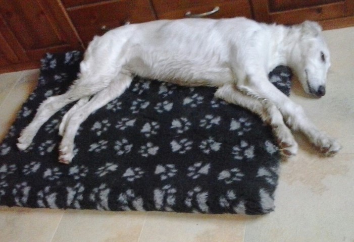 04.09.2014: Überraschung!!! Heute Morgen waren es 9! Ein Junge mehr! Alles wohl auf! (Alles Weitere unter: Welpen.) 03.09.2014, 20:45 Uhr: High stellte sich auf ihr Bett und flupp: Da kam auch schon der erste Welpe: Alpha! Damit hatte ich noch gar nicht gerechnet! Unser TA auch nicht! Um 21:20 h der nächste junge Mann, Um 21:45 h und um 22:50 h erblickten die ersten 2 Mädchen aus Licht der Welt und um 23:10 h wieder ein Junge! Das 6. Mädchen kam um 24:20 h zur Welt und die beiden letzten Jungs um 01:05 h und 02:15 h! Jetzt sind alle da, 8 ( 5/3 ) an der Zahl, und ich bin froh, dass alles so reibungslos abgelaufen ist! Mutter und Babys sind wohl auf! Karin, die sofort kam, hat kräftig geholfen, so war es für mich auch ganz entspannt, genau, wie bei High! 03.09.2014: Am Vormittag kam unser TA und brachte mir alles, was nötig ist, wenn es zu Komplikationen bei der Geburt kommen sollte. Da Karin und ich medizinisch sehr gut bewandert sind, sollte es keine Probleme geben. Und unser TA hat das Handy am Bett! Er untersuchte High noch einmal gründlich, ihr fehlt es an nichts, er rechnet mit der Geburt in den nächsten 2 Tagen, am 4. 9. wäre auch die Zeit um. 30.08.2014: Heute war Münster angesagt! Ludger machte sein Versprechen wahr und führ mit! Ich war völlig irritiert, weil wir nicht so richtig auf den Parkplatz kamen. Auch waren in der Bahn gar keine Ringe abgesteckt: In der Rennbahn war"Land unter"! Somit hatte man notgedrungen den hinteren Teil des Parkplatzes mit 2 Ringen bestückt! Eng, aber heimelig! Wir hatten mit dem Wetter Glück im Unglück: Es blieb so lange trocken, bis die Barsois durchgerichtet waren! Glücklich sind wir über das Jugend-CAC von Odaloij!!! Auch Niemen bekam sein V1! Leider hat Volia nur ein SG bekommen, sie war einfach zu "kahl" nach der Läufigkeit. Auch war es eine sehr große Klasse, doch wann, wenn nicht jetzt?! Immerhin hat sie schon ein CAC. Warum nicht noch mehr? O.K., nächstes Mal bekommt sie Extensions! Berendaij war unterdessen in Greppin ![]() und belegte V2, Res.-CAC. Er war ZU DICK! Und ich war doch so froh, dass er etwas zugenommen hatte, weil er MIR zu dünn war! Was soll ich dazu sagen? Trotzdem ein vorzügliches Ergebnis! 26.08.2014: Heute habe ich die Wurfkiste aufgebaut und schön weich ausgepolstert, damit High sich schon einmal daran gewöhnen kann. Volia wollte auch gleich rein! Während ich das mit ihnen ausprobierte, haben sich Opal und Odaloij vom Acker gemacht, besser, sie liefen auf dem Acker! Erst Opal, der froh war, als ich ihn rief! Sofort kam er angerannt! Dann sah Odaloij seinen Bruder nicht mehr und kroch auch durch den Tunnel! Aber auch er war froh, als er mich sah! Nichts Schlimmes passiert! Die beiden haben wohl zu viel Nachrichten gesehen und wissen nun, wie die Palästinenser aus Gaza ihre Tunnel graben! Ich hatte den ersten ja dicht gemacht, doch jetzt ist Schluß damit: Udo kommt gleich mit "schwerem Geschütz"! Dabei wollen wir den Hundeweidenzaun sowieso erneuern, allerdings erst, wenn Achim wieder da ist! High und Volia beim Fressen, die Wurfkiste und dann - High ganz entspannt in ihrem Refugium! Probeliegen!