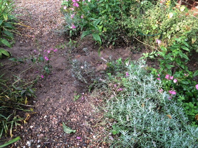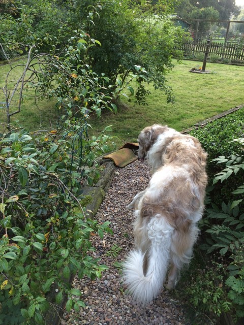 07.09.2014: Gerade hatte ich High hinten wieder gewaschen und machte das Bad sauber, da kam High wieder um die Ecke. Ich traute meinen Augen nicht!!! Wo war die denn drin?? Schwupp, war sie bei ihren Welpen verschwunden und wirkte äußerst zufrieden mit sich und der Welt. Ich gleich hinter her: Der Flur voll Dreck, die Küche voll Dreck, die Hündin voll Dreck! Oh!!! War sie im Teich? Also: Nachsehen. Wo Maxim und ich tags zuvor noch schöne Bilder machten, sah es aus, als hätte ein Mörser eigeschlagen! Ein fast knietiefes Riesenloch in meiner Blumenrabatte!!! Der Kiesweg nicht mehr zu erkennen!!! Ohh!! Auf den Bildern ist es gar nicht so recht zu erkennen! Ohh!!!