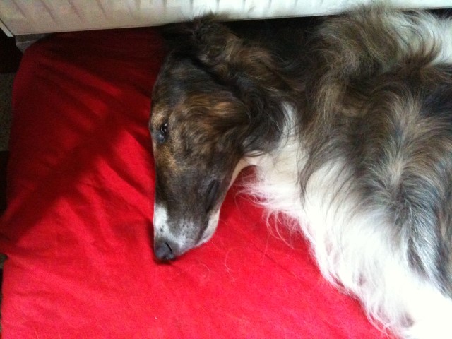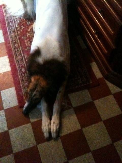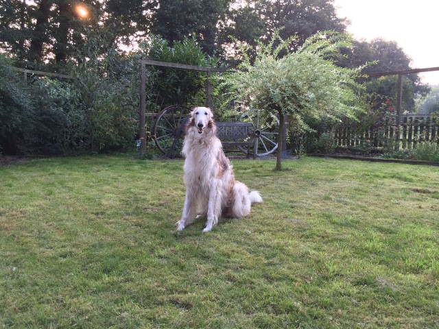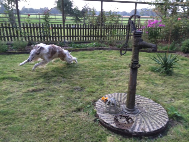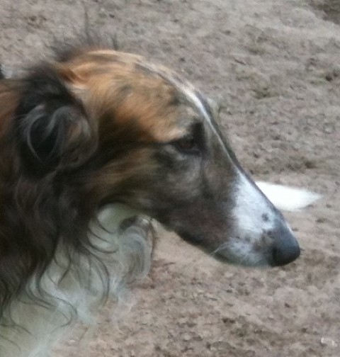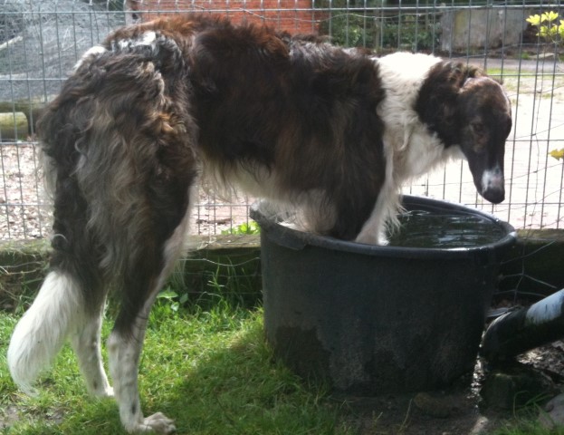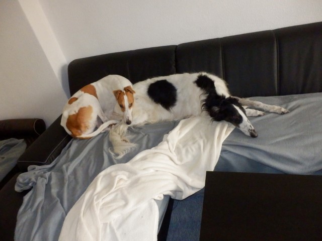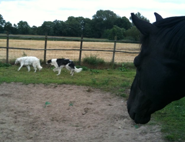 22.08.2014: Achim rief mich an: sag mal, willst Du den Scheckenverband sabotieren? ( Ich betreute deren website. ) Was war geschehen: Ich hatte auf deren website gearbeitet und dann etwas bei mir auf news geändert. Dabei habe ich beim Hochladen nicht gemerkt, dass ich den ZSSE-Ordner noch auf hatte und somit war meine news-Seite jetzt auch die der Schecken! Was mögen die wohl gedacht haben, wenn sie das gesehen haben!!!! Doch Schecken sind unsere Barsois ja auch! 21.08.2014: Welch ein Tag! Wir wollten die Pferdeweiden aufarbeiten! Dann jedoch haben sich Opal und Odaliy unter dem Hundeweidenzaun "gearbeitet", als ich ihnen ihr Frischfutter geben wollte, fehlten die 2! Ich suchte überall!!! Dann - völlig frustriert - fuhr ich nach Hause, wollte die Polizei informieren! Doch das Telefon blinkte: Ich sah: Nummer aus Höne! Also Rückruf: Eine meiner Lieblingsnachbarn! Elisabeth sagte: Vermisst Du 2 Hunde?- Ja!- Die haben aber etwas Mist gebaut! Mir rutschte das Herz in die Hose: Oh Gott! Hoffentlich nicht die Schafe!!!!! Nein, sie waren in den Hühnerstall eingebrochen!!! Auch schlimm!!!! Nun, es sind Lieblingsnachbarn, so haben wir erst einmal auf den Schrecken einen Schnaps getrunken und meine Nachbarn kaufen neue Hühner, so bin ich glücklich, dass es so abläuft und wir so gut miteinander können! Während dessen hatte ich den Hündchen ja Geflügelklein mitgebracht! Das hatte ich in der Eile in der Sattelkammer abgestellt. Nun war die High im Haus und die hat das gnadenlos ausgenutzt! So dick habe ich sie noch nie gesehen!!!! Vollgefressen konnte sie sich kaum noch bewegen! Oh, heute also nicht laufen! Aber morgen wieder! Sie ist trotzdem traumhaft lieb! Ich bin glücklich, dass sie bei mir ist! Hätte ich sie doch schon eher gehabt! Aber sie hat es gut hier und ist soooo relaxt, so wäre sie schon immer hier! Sie ist wirklich traumhaft und auch die Jungs kommen gut mit ihr aus und respektieren sie absolut!