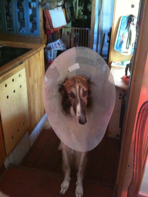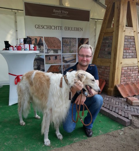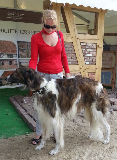 Christian mit Niemen und Berendaij mit mir vor Ronny`s Stand mit alten Steinen und Ziegeln. Ludwina bestach unsere Barsois mit leckerem Futter von Anifit! Sie wollten gar nicht wieder mit!!!! 26.07.2014: Hildesheim steht an, dort fahre ich immer gerne hin! Doch seit gestern regnete es hier "Bandwürmer!! Auch heute Morgen schüttete es aus Eimern! Niemen sah aus, wie ein begossener Pudel! Sollte ich fahren? Naja, man gönnt sich ja sonst nichts, und wie oft war das Wetter auch nur 50 km schon anders, als doch los. Kurz vor Hildesheim wurde es trocken, ich atmete auf. Eigentlich hatte ich ja auch Volia gemeldet, doch die ist ja läufig. Auf dem Platz angekommen, erfuhr ich von einen kompletten Richterwechsel! Hochachtung vor dem Verein, dass sie alles in letzter Minute noch organisiert bekommen haben!! Doch die Barsois wurden von jetzt von Herrn v. d. Broek gerichtet! Sollte ich dennoch ausstellen? Ich ärgerte mich innerlich über mich, wegen nur einem meiner Hunde hergefahren zu sein! Dann traf ich eine Ausstellungsbekannte, die mir erzählte, ALLE seien böse auf mich, weil ich einen Wurf mit High Society mache! Wer ALLE sind, weiß ich nicht, doch ich mische mich auch nicht in die Angelegenheiten anderer Züchter, und ich habe hier eine wunderschöne Hündin mit einem ausgezeichnetem Pedigree zur Zucht! Nur, weil die Vorbesitzerin aus nicht benennbaren Gründen von einigen im DWZRV für eine Persona non grata erklärt wurde, soll jeder von ALLEN bestraft werden, der mit ihr in irgendeiner Weise zu tun hat? Hm! Und - was kann der Hund dafür? Worum geht es hier, um unsere Windhunde oder um was? In der Ausstellung bekam Niemen sein V1, VDH, das war es erwartungsgemäß dann auch! Also: es hätte ruhig weiter gießen können, der Tag war eh gelaufen. - Doch wie heißt es immer so schön bei Asterix?: Alle? Nein, ein ....! Und so war es auch hier! Gerlinde und Gabi kamen aufmich zu und wir begrüßten uns herzlich! Auch waren Jürgen und Herbert da, Jürgen hatte mich schon gesucht! Und somit war der Tag schon aus seinem Grau raus! Riesig glücklich waren wir, als Jürgens Hündin Blandis aus der Veteranenklasse heraus das BOB machte!!! Und als die Barsois fertig waren, kam die Sonne durch, als hätte sie extra so lange gewartet! So saßen wir, zusammen mit Angelika und Lars im Schatten der großen Bäume mit unseren Hunden und ließen es uns gut gehen, erzählten, lachten, hatten Spaß, genau, wie bei Asterix! 25.07.2014: ich hatte mir solche Mühe gegeben, die Jungs für das "Showgeschäft" fit und Maxim und Niemen vor allem SCHLANK zu halten, denn gerade deren 2. Name ist FRESSEN! Nun erfuhren wir gestern von einer Richterumbesetzung in Hildesheim ( das hatten wir da schon einmal! Damit verbinden wir einiges! ), und Niemen war darüber so frustriert, dass er nachts in die Sattelkammer einbrach und sich den Bauch mit dem für heute für ALLE vorgesehenen Hähnchenfrischfleisch vollgeschlagen hat. Heute Morgen traute ich meinen Augen nicht, welch eine "Kugel"!!!! "Tüte" ( Nabat ) eckt überall an, ich höre immer klack, raaatsch, bopp, wenn er irgentwo hin will! Er tut mir von Herzen leid, doch er leckt die kleine Wunde, so dass sie am Heilen gehindert wird. Deshalb bekam er eine Tüte. Nun werde ich angesehen, als sei ich ein Schwerverbrecher, der ihm Übles angetan hat. Doch wir sind ja erfinderisch: