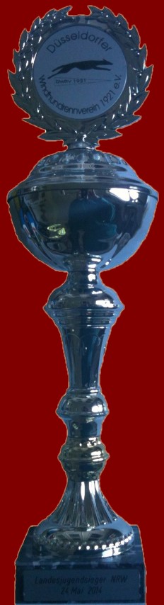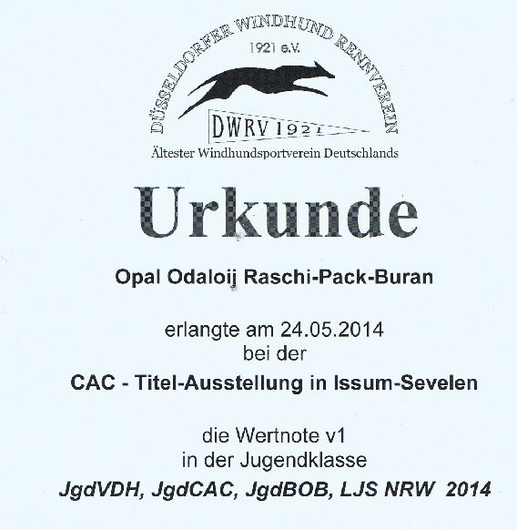 24.05.2014: 6 Uhr, auf gehts nach Issum! Gut, dass es Navis gibt. Und gut, dass ich mich warm angezogen habe! Über 50 Hunde vor uns - völlig ungewohnt, denn B wie Barsoi ist meistens eher dran. Kalt wars und windig! Ich habe mich erkältet und Opal hatte zuletzt überhaupt keine Lust mehr, immer wieder raus aus dem Auto, übers Feld laufen und trotzdem konnte er nicht! Bei Niemen sah das natürlich ganz anders aus: er fand das prima und war dann auch demendsprechend "gelb". Da wir das Glück hatten, direkt am Ring parken zu können, sahen sich die beiden mich und gegenseitig, wenn einer von ihnen starten mußte! Das Klagen war groß - und laut! So war ich dankbar, dass mir immer einer abgenommen und außer Sichtweite gebracht wurde, sonst wäre gar nichts gegangen! Im Stechen um den besten Rüden hatte Opal, 10 Monate, gegen Herrn van den Broek`s Siegerklassengewinner anzutreten, Frau van de Lee-Grevelt begründete: der andere ist fertiger. Als alles vorbei war, nam sie mich zur Seite: ich solle gut auf ihn aufpassen, das wird ein richtig toller Hund! Ich habe mich sehr gefreut! Opal wurde Landesjugendsieger, bekam das Jgd-VDH, Jgd-CAC und errang das Jgd-BOB, besser geht es nicht. Niemen hätte ich eigentlich gar nicht starten lassen brauchen, er bekam das erwartete V2 in der Siegerklasse. Nach 22:00 Uhr waren wir wieder zu Hause - ein langer Tag!