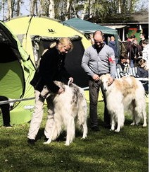 18.04.2014: Landessieger-Ausstellung in Hoope! Ich bin eingeteilt als Ringordner bei Herrn Dux, Belgien. Das hat sehr viel Spaß gemacht, ich habe viel gelernt und mit Sabine Wirbel waren wir ein gutes Team. Wettermäßig ging es so, das eine oder andere Regenschauer erwischte uns schon. Ich konnte unsere Barsois trotzdem Streß-frei bei Frau Peschges ausstellen, Achim bürstete die Hunde und Joyce half mir beim Stechen, ganz lieben Dank dafür! Mit Nabat lief ich mit "Oenk-Oenk" durch den Ring, das Zauberwort zum Radfahren! Und er lief!!!! So haben wir alles gewonnen, was für uns ging! Wie sehr ich mich gefreut habe!!!!!!