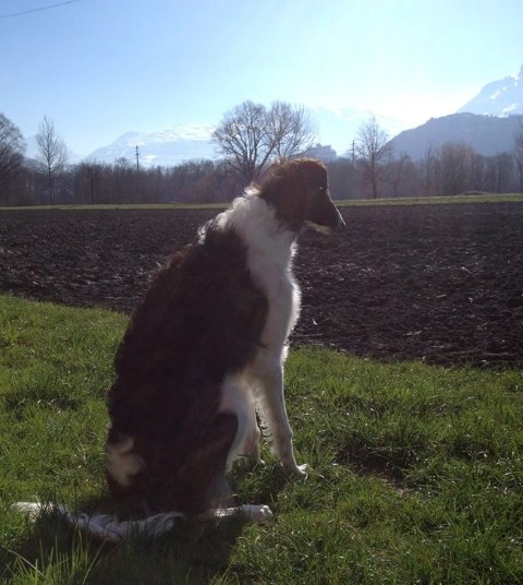 24.03.2014: neue Bilder von Otvaya aus Liechtenstein! Ein schönes Gesicht hat er! Und typisch Barsoi: in die Weite schauen ( wenn da die Berge nicht wären...... )!