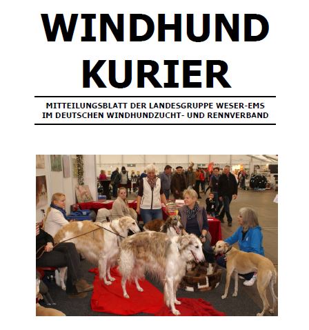 17.02.2013: Heute hatten wir einen Termin bei unserem Tierarzt, Lew klappert ja immer etwas mit seinen Zähnen und hat einen ganz aufgeschwemmten Gaumen, dem wollten wir auf den Grund gehen! Außerdem brauchte Opal die erste Tollwutimpfung, die Ausstellungen gehen ja los! Lew hat eine gute oder eine schlechte Prognose: wenn alles gut geht, helfen Antibiotika, wenn die nicht anschlagen.......... ! Mein Herz ist so schwer! Als wenn man nicht schon Kummer und Sorgen genug hätte, immer noch eins drauf! 25.01.2014: oh, wie freuen wir uns darüber!!!!!! Hier das Titelbild des "Windhundkuriers Weser-Ems": Unsere Hunde " Niemen, Maxim und Nabat" sind am Stand unserer LG Weser-Ems auf der großen Haustiermesse "Mein Tier" in Oldenburg. 22.01.2014: der Familienrat hat beschlossen, Opal mit einer Rundumleuchte auszustatten, damit man die Gefahr, die sich da nähert, früh genug erkennen kann: