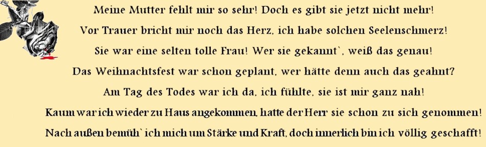 Die Jahreswende 2014/2015 Das ist normalerweise der Zeitpunkt des Rückblicks und des Résumés. Für mich persönlich war es ein sehr hartes Jahr, und ich möchte die Ereignisse in "Menschliche" und "Tierische" unterteilen. "Menschliche" Ereignisse: Unsere Ex-Mieter hatten unser Haus in Soest total verwüßtet! Wir mußten es Grundrenivieren im wahrsten Sinne des Wortes! Das trieb uns fast an den finanziellen Ruin, doch - Gott sei Dank - nur fast. Dennoch mußten wir alle Wünsche zurückstellen und auf vieles verzichten, um alles zu meistern, denn ein Unglück kommt ja bekanntlich selten allein. So wurde mein lieber Mann krank und konnte 5 Monate lang nicht arbeiten. Was es heißt, von "Krankengeld" zu leben, kann man sich ja ausrechnen, und das in dieser Situation! Doch es gibt noch viel Schlimmeres: Um Ostern verstarb mein bester Freund und Vater meiner besten Freundin und zu Weihnachten meine geliebte Mutter! Am Silvestertag wurde sie zu Grabe getragen. Diese 3 Feste der Liebe und Freude werden immer wieder nur schmerzliche Erinnerungen in uns wachrufen, auch, wenn wir versuchen, dem zum Trotz das Beste daraus zu machen. - Doch es gab auch schöne Dinge, die uns widerfuhren: So lernten wir andere Menschen kennen und neue gute Freundschaften wurden geschlossen, dafür sind wir sehr dankbar! "Tierische" Ereignisse: Im Gegensatz zu den menschliche Begebenheiten hatten unsere Tiere - Pferde und Hunde - mehr Glück: Niemen wurde in diesem Jahr LS Weser-Ems 2014, Opal und Odaloij wurden beide Jugend-Champion DWZRV & VDH, zusätzlich wurde Opal Jugend-LS Nordrheinwestfalen und Frühjahrs-Jugendsieger VDH, Odaloij gewann noch die Titel: Jugendsieger Baden-Württemberg und Jugendsieger Karlsruhe. Natürlich haben andere Aussteller genau so viel, oft sogar mehr Erfolg, doch ich bin sehr glücklich darüber. Desweiteren hatten wir nach mehr als 20 Jahren endlich wieder einen Wurf, diesmal unter unserem neuen ( 2002 ) Kennelnamen " zu elben Äiken"! 9 süße Welpen erblickten das Licht der Welt und ich sehr glücklich, dass alle ein schönes, liebevolles Zuhause gefunden haben! Ein kleiner "Terrorist" bleibt natürlich bei uns. Für diesen schönen Wurf erntete ich viel Lob und Anerkennung, doch der einen und dem anderen war er auch ein Dorn im Auge, es "menschelt" halt überall. Unser Vollblüter "Southerly" wurde in diesem Jahr gekört und gewann bei einer Hengstvorführung und bei unseren Hamburger Silberlack-Hühnern stellte sich Nachwachs ein. Und so danke ich an dieser Stelle allen aus vollen Herzen, die mir geholfen haben, dieses Jahr zu meistern! ![]() ![]() 31.12.2014: Heute wurde meine geliebte Mutter zu Grabe getragen! Mein Herz ist schwer! So geht nun ein hartes Jahr für uns zu Ende und uns bleibt die Hoffnung, dass das Neue Jahr 2015 für uns persönlich wieder ein besseres Jahr wird als das Vergangene war. ![]() Jetzt leben auch die beiden letzten Geschwister getrennt! Amethyst tröstet sich mit Odaloij! ![]() ![]() Dorosha fragt: Ich kann Dich gut leiden! Willst Du mit zu uns? ![]() 30.12.2014: Wunderschöne Winterbilder von Oblonka und ihrer Freundin: ![]() ![]() ![]() ![]() ![]() ![]() 26.12.2014: Gestern noch schien - zumindest zwischen den Regenschauern - noch die Sonne, heute herrschen Nebel, der sich nicht auflösen will, und Frost! Und, so habe ich mit Erstaunen festgestellt: Wir haben sogar Eiszapfen an der Dachrinne! Na gut, Eiszäpfchen, aber immerhin! Und Otvaya grüßt auf diesem Weg all seine Geschwister und ihre Frauchen und Herrchen!
