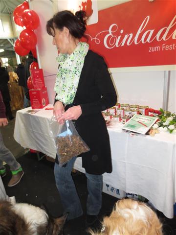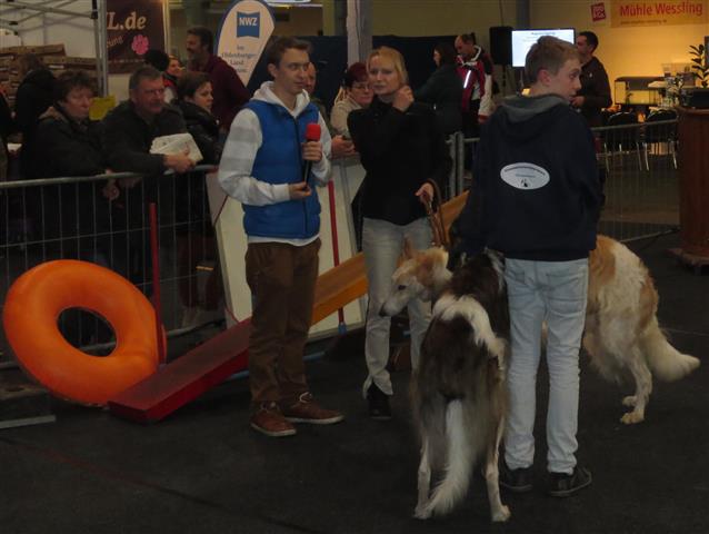 ![]() Super schön hoch angesetzte Ohren, klein und spitz zulaufend! Richtig gewinkelt und voller lebenslust. Sie sind unzertrennlich und spielen toll miteinander! ![]() 18.01.2014: Am Stand von Ludwina haben wir uns sehr wohl gefühlt: Die Barsois durften alle Arten Hundefutter probieren und es schmeckte ihnen vorzüglich!!! Ich kann das beurteilen, denn normalerweise verschmähen sie auf Veranstaltungen jedliche Art von Futter und Leckerlis, doch hier konnten sie nicht genug davon kriegen, mir war es schon richtig peinlich...... Aber auch für Hagen und mein leibliches Wohl wurde super gesorgt. Am frühen Vormittag war es noch ruhig und wir konnten bequem mit den Hunden durch die Hallen bummeln, doch dann kam man kaum noch durch.
