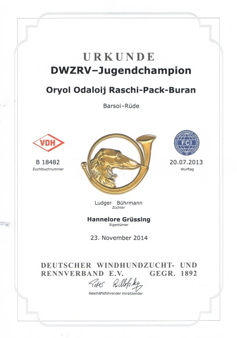 06.11.2014: Heute war wieder ein spannender Tag für die "elben Äikener": Niemen brach zum Kennel "Raschi-Pack-Buran" auf, denn Bohdana, die schöne Schwester von Berendaij, ist läufig und so soll Niemen zum 2. mal "Vater" werden! Im Gegenzug kam Odaloij wieder zu uns nach Dinklage, seinem 2. Zuhause. Danach wurde Alexej abgeholt und ist gut in Bremen angekommen. Da wir morgen nach Karlsruhe aufbrechen wollen, habe ich Berendaij schon zu Christoph nach Soest gebracht, damit die Hunde genügend Platz im Auto haben und alle bequem reisen können, denn auch Aron fährt mit uns und wird zu seiner neuen Familie gebracht. Jetzt heißt es, alles einpacken, damit wir morgen nichts vergessen! 01.11.2014 CAC JG2.11.: Und wieder machten wir uns auf den beschwerlichen Weg nach Hannover! Diesmal jedoch nicht über die Landstraßen! Doch da unsere fahrbare Hundehütte über 80 km/h momentan nicht hinauskommt, dauerte es wieder sehr lange, ich war um 5:00 Uhr losgefahren. Niemen hatte ich zu Hause gelassen, da ich alleine los mußte. Doch das war eine Überraschung: Berendaij und Opal waren so entspannt, so konnte auch ich mich entspannen! Opal war als erster dran, er hatte starke Konkurrenz, vor allem - wesentlich ältere. Und er brauchte ja nur noch ein VDH von der CACIB, um VDH-Jugendchampion zu werden....... ! Und Opal hat Grund zum Feiern: Ab heute ist er auch VDH-Jugend-Champion!