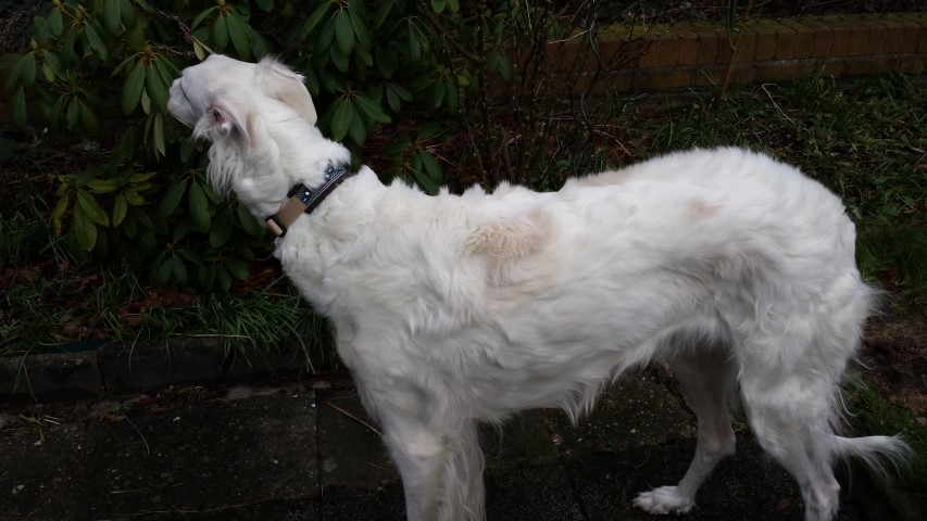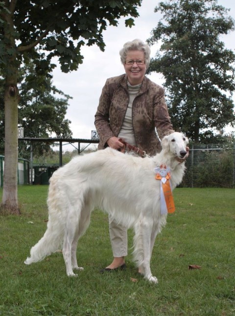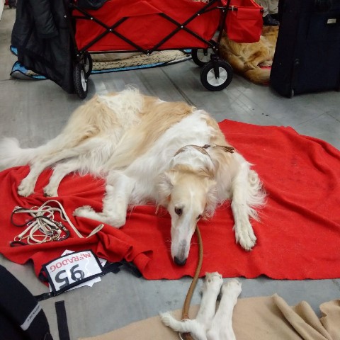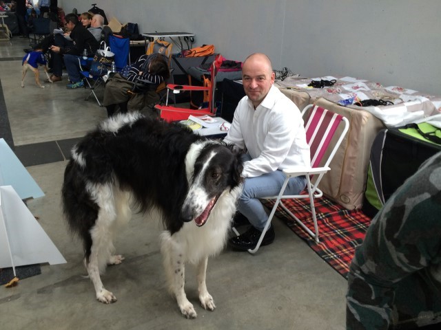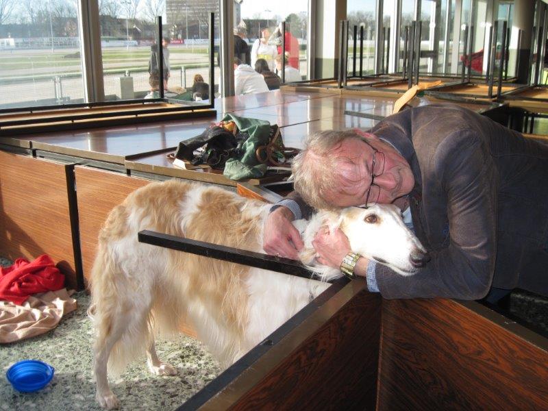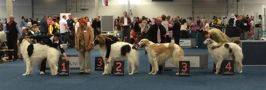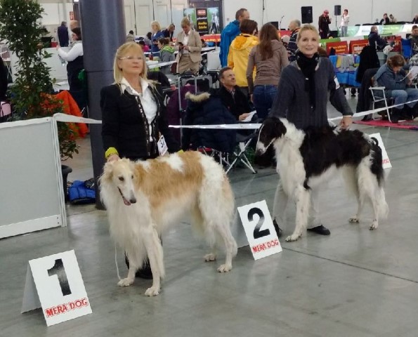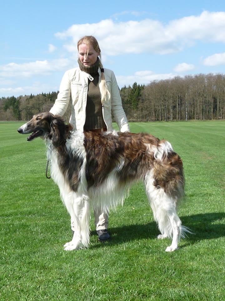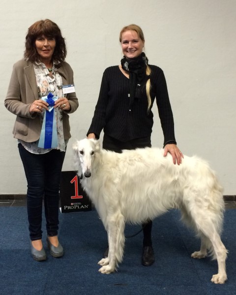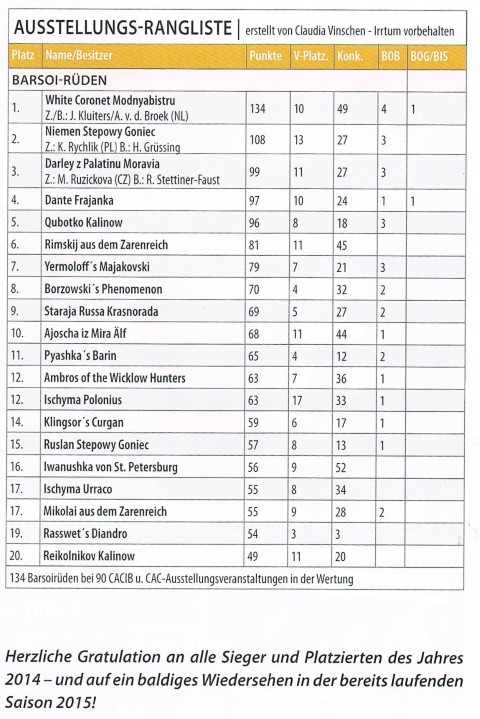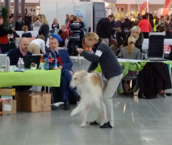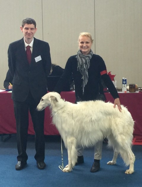 12.03.2015: Heute freue ich mich sehr mit Niemen, der es unter die ersten 3 geschafft hat: Er wurde 2.!!!! Und er ist "nur" mein Hund, ich bin ein "nomame", also kein besonderer Mensch in der "Barsoiszene": Weder Richter, noch sonst zu der Zeit als Züchter besonders bekannt! Und deshalb bin ich sehr glücklich über seinen 2. Platz!!! Ich habe ihn nur lieb und deshalb gerne ausgestellt ! Ich danke jedem, der mir geholfen hat, mir mit Rat und auch Tat zur Seite stand, besonders meiner Freundin Karin und Christoph und auch besonders Heidelinde, die mir viel an ihren Erfahrungen hat teilhaben lassen! Ohne sie alle hätte Niemen diesen Erfolg nicht geschafft, weil ich längst den Mut am Ausstellen verloren hätte. Niemen hat in den 3 Ausstellungen, auf denen er jetzt in 2015 schon war, 3 x V1 bekommen, 2 x BR und 1 x BOB! Ich freue mich, dass ich ihn habe, aber diese Saison soll ausstellungsmäßig seine letzte sein, weil er es sehr liebt, doch er hat es verdient, in den"Ruhestand" zu gehen. So denke ich, mal sehen, was er dazu sagt!?!? 09.03.2015: Live dabei: