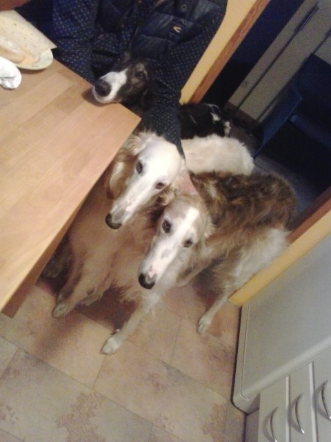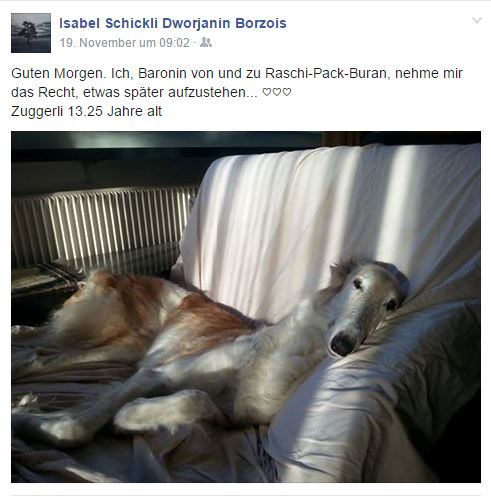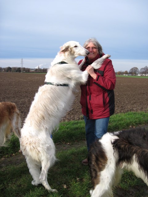 ![]() Karin wartete tapfer und freute sich sehr mit mir! 04.12.2015: Amethyst und ich duschten, und ich packte die Koffer. Um 18:00h kam Karin und wir fuhren nach Kassel. Ich war - wie immer - sehr aufgeregt. Im Hotel angekommen, in`s Appartement, auspacken und dann zum Thailänder zum Essen! Amy durfte auch mit! Für ihn bedeutete es: Das 1. Mal Fahrstuhl, Treppe, allein ohne die anderen Barsois und vieles andere mehr!!! Aber er absolvierte es, als hätte er nie etwas anderes gemacht! So ein lieber Hund! ![]() 01.12.2015: Es nieselt und stürmt! Aber Niemen und Nabat sind ehrgeizig und wollen mindestens 2 mal am Tag eine ausgibige Fahrradrunde drehen! Achim darf sich weder Schuhe noch Jacke anziehen, dann "nerven" sie ihn schon! ![]() ![]() November,der dunkle Monat ![]() 30.11.2015: ![]() 25.11.2015: "Gesundes Essen tut gut." So dachte wohl auch Beri: 3 Minuten nicht im Raum - aus der leckere Essenstraum! Er ist nun satt und ich muß hungern! dabei sollte er abspecken......! 23.11.2015: Unsere Pferde haben einen Zahnarzttermin: Frauchen, er hat aber gar nicht gebohrt ..... ! Toll fanden sie es nicht, doch das Fressen geht jetzt wieder besser! 22.11.2015: Der erste Schnee! Doch dann kam am Nachmittag doch noch die Sonne durch, und ich verabrede mich mit Anne zu einem Spaziergang mit Niemens Töchtern Panja und Pandora. Es hat uns allen Spaß gemacht! ![]() Abends zu Hause habe ich es mir dann bequem gemacht: Hunde rein, Füße hoch, Tatort an! 17.11.2015: Etwas Grundsätzliches: Ich liebe es, am Sonntag den "Tatort" zu sehen! Füße hoch und gut! Achim ist dann meistens im Wohnzimmer, auch schön, doch: Die Hunde!! Sie sollen zumindest einen Raum sauber halten!Deshalb ist es ein "geflügeites Wort" dafür, einigermaßen früh am Abend zu Hause zu sein! Doch oft gelingt es mir nicht. Aber, wenn ich denn zu Hause bin, ist es für mich ein Frefel, um 20:15 h gestört zu werden, ich genieße dann meinen "Feierabendwhiskie" und bin froh, abschalten zu kömnnen! Doch liebe Freunde dürfen mich immer anrufen! Ich fand diese Nachricht von Isabel und habe mich sehr darüber gefreut, wieder eine "alte" Dame zu sehen: 16.11.2015: Wir sind glücklich, aber totmüde zu Hause angekommen! Für Opal ist in diesem Jahr die Ausstellungssaison zu Ende. Er hat sich toll geschlagen und ich bin sehr glücklich, dass er es geschafft hat, mit nur 2 Jahren und 3 Monaten Dt. Ch. zu werden. Ich konnte seine VDH-Anwartschaften sogar nur mit VDH-Ausstellungen einreichen und brauchte gar keine vom DWZRV. Die CACs, die er in seiner Wartezeit bekam, konnten wir ja weitergeben, doch für die VDHs gilt das ja leider nicht, aber jetzt! 15.11.2015: Alles wurde wieder ins Auto verstaut, Opal hatte sich schon auf der Hinfahrt als Hafensänger geoutet und seine Songs begleiteten uns auch wieder auf der Fahrt zur Halle. Ein neuer Tag - ein neues Glück! Und so war es auch: Die Windspielfraktion holte, wie fast immer, alle Preise, und Opal wurde Dt. Champion VDH, Augenweide wurde aus der Jugendklasse heraus "beste Hündin"!!!!! Sie setzte sich in der Jugendklasse durch, bekam auch das Jgd-BOB und im Stechen um die beste Hündin schlug sie sogar die Championklasse!!!! Was für ein Glück für Besitzerin und mich als Züchterin!!!! Im Stechen um das BOB wurde allerdings der reifere Rüde ausgewählt! Für uns alle war das ein Grund zum Feiern, Gewinner Walter lud uns alle ein, es war ein wunderschöner Abschluß eines tollen Wochenendes: Jeder von uns war glücklich und zufrieden, was wünscht man sich denn mehr? Ja, es gab noch etwas: Eine gute Heimfahrt! 14.11.2015: Die Ausstellung in Karlruhe ist auf Grund der Halle schon sehr schön. Unsere Windspielfraktion war überaus erfolgreich, die Barsoifraktion weniger. Opal konnte nicht am Stechen teilnehmen, weil der Ringwart uns "nicht finden" konnte! Dabei standen wir am Ring! Augenweide bekam ein V2, Renate war sehr zufrieden, ich weniger! Opal hatte so die Nase voll von dem Trubel, er wollte nur noch weg! Er war nicht einmal mehr für die "Rassevorstellung" zu haben! Doch die Zeit mit Freunden zu verbringen, war alles wert! Walter bekam mit seinem schönen Barsoi über die Zwischenklasse das erste "große" VDH, genau, wie im Jahr zuvor Opal. Abends waren wir in einem schönen, gemüdlichen Lokal essen, auch Opal bekam von der freundlichen Bedienung eine leckere Portion! 13.11.2015: Opal wurde gebadet und der Koffer wurde gepackt, die große Hundebox kam in den Shire und auf gings nach Soest. Von dort aus fuhren wir zu dritt in Frank und Inga`s Auto nach Karlsruhe. Viele Baustellen behinderten unsere Fahrt, dazu kamen Regen und Sturm, das verzögerte unsere Fahrt über eine Stunde. Doch getoppt wurde es von einer Vollsperrung der Autobahn, deren Rückstau uns 500 m vor unserer Abfahrt erwischte. Selbst über den "Standsteifen" kamen wir nicht weiter! Die Nacht wurde entsprechend kurz! 12.11.2015: Heute ging es den Linden an den Kragen! Jedes Jahr müssen sie in "Form" geschnitten werden. Eigentlich hätte das schon viel früher passieren sollen, denn sie verdunkelten das Wohnzimmer sehr. Landschaftsgärtner Christian hat geschnitten und ich habe geschreddert! Heute sind noch die Blätter dran, dann ist die Nordterasse wieder o.K. 08.11.2015: Der Fluch der Technik! Achim hat einen neuen PC, so weit - so gut. Doch nun ging es los: Mein Hintergrunbild war weg! Also wieder neu aufgespielt! Fluchen von Achim: Ich habe Deine Pferde!! Achim stellte wieder seinen PC auf häßliche, graue Wassertropfen um und zack, ich hatte ihn auch! So ging das immer wieder hin und her. Erst war das ja noch ganz lustig und ich konnte Achim gut ärgern, aber ich bekam ja auch promt die Retourkutsche in Form von "Regentropfen" und das ärgerte mich natürlich auch. mal sehen, wie das weitergeht.... 07./ 08.11.2015: