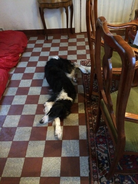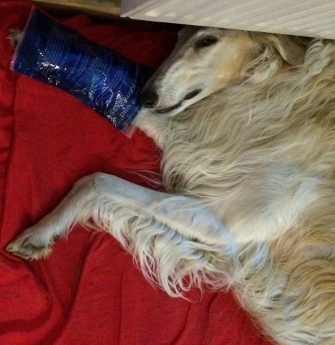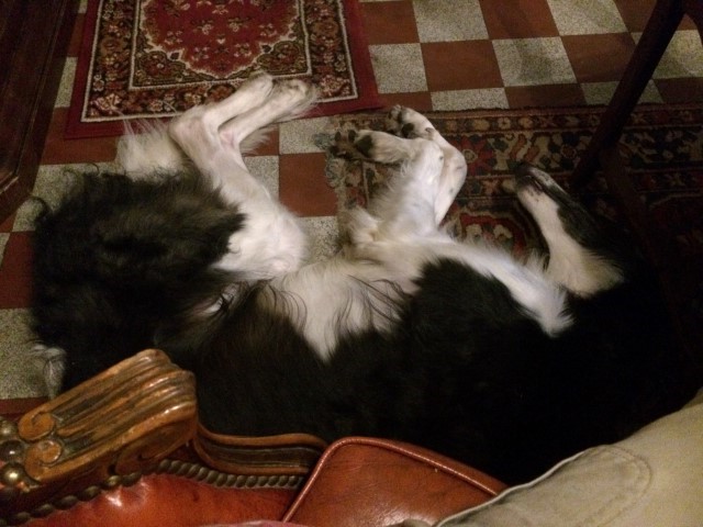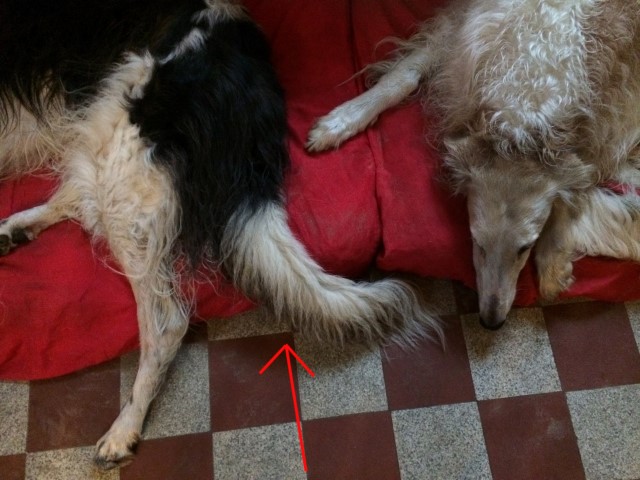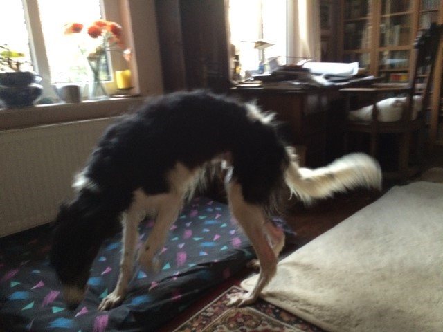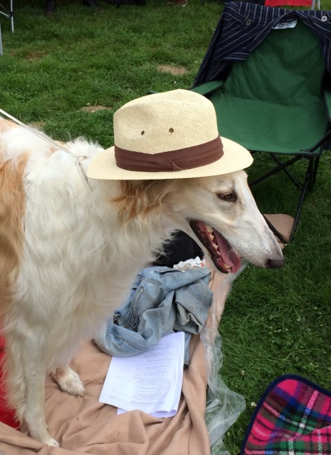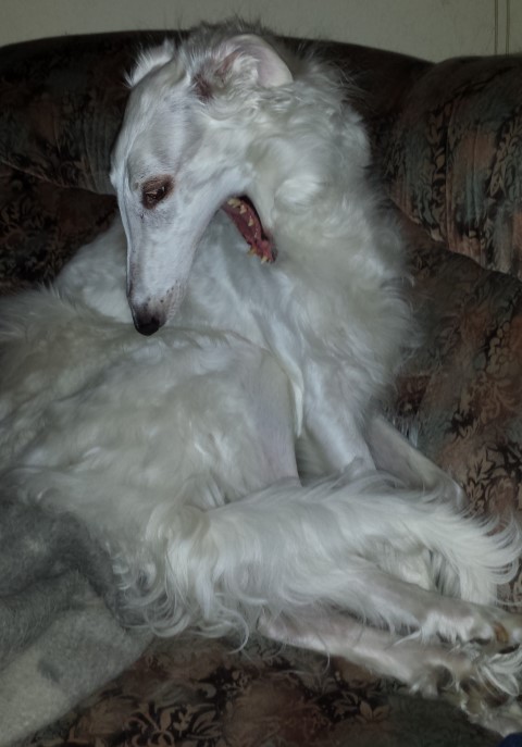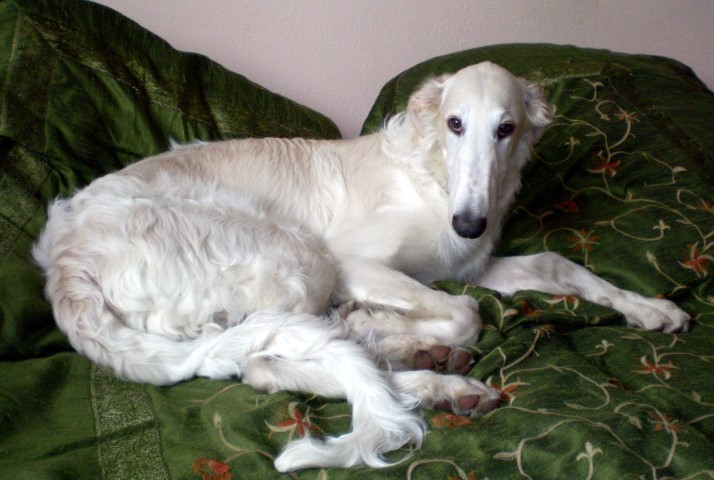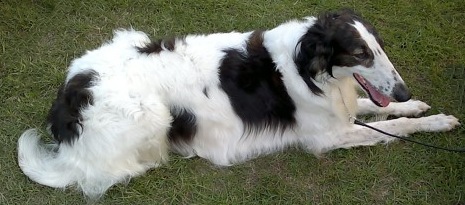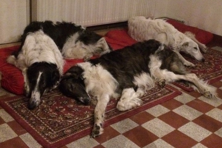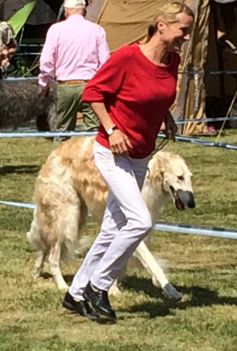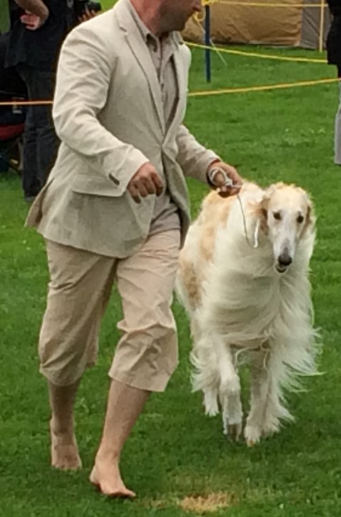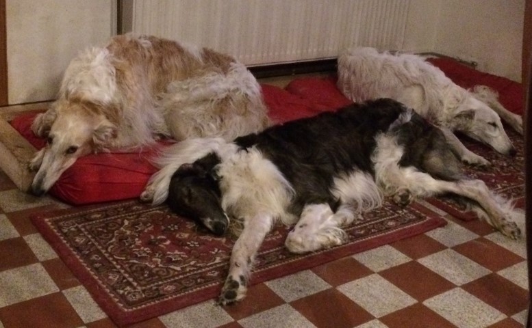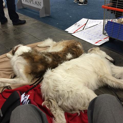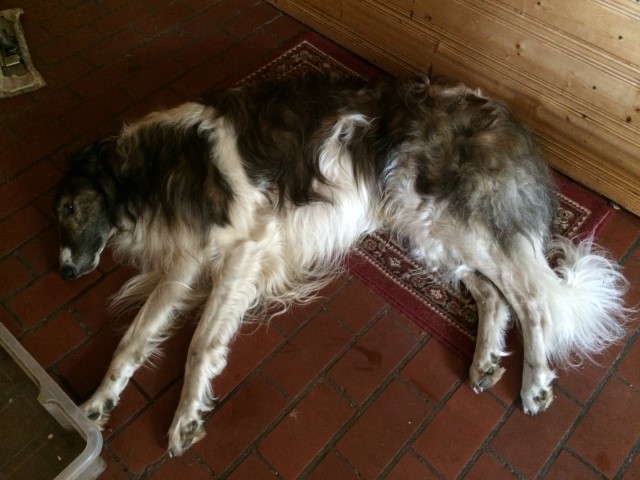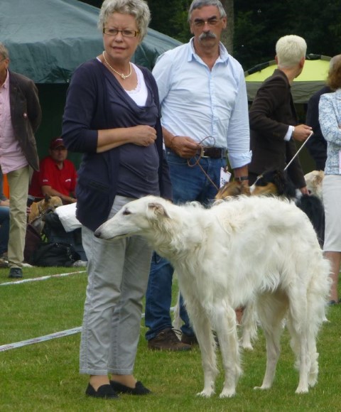 24.05.2015: So kann auch nur ein Barsoi liegen: 23.05.2015: Gelsenkirchen, sonst immer eine Reise wert! Irgendetwas nehme ich immer mit, und sei es die Erinnerung an einen schönen Tag in lieber Gesellschaft! Das Wetter hielt! Wir hatten einen schönen, großen Ring und wir alle waren guter Laune. Der australische Richter, Mr. Keith Prior, erinnerte uns ein wenig an einen Abgeordneten aus dem englischen Oberhaus. Ich war immer davon ausgegangen, dass der FCI-Standard weltweit gilt! Unsere Jüngsten wurden 2., 3. und 4., Opal 2. und Niemen wurde in der Championklasse mit mir als einziger Deutschen hinter den Niederländern 4.! ( Ich hatte das Gefühl, wäre noch ein Holländer mehr gemeldet gewesen, dann ......) In der offenen Klasse war es ähnlich wie in der Championklasse, wie gut, dass wir dort keinen Hund am Start hatten. Eigenartig war das alles schon, mehr möchte ich dazu nicht sagen. Aber die Zuchtgruppe, die haben wir gewonnen! Nun ja, so freuen wir uns eben mit für die anderen Gewinner, und das ist auch schön.