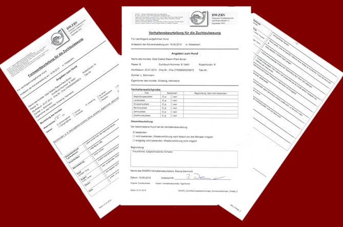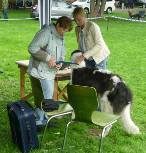 ![]() 19.09.2015: Heute soll Opal die "Lizenz zum Decken" bekommen! Also habe ich gestern den Beifahrersitz aus dem SLK ausgebaut und eine dicke Decke reingelegt, weil ich einfach keine Lust hatte, wegen eines Hundes die "Hundehütte" zu nehmen! Opal stieg ein, als hätte er nie woanders gesessen. Um 10:30 h starteten wir mit dem "Wesenstest"! Ca 30 Hunde waren angemeldet und somit dauerte es ganz schön lange, bis alle "durch" waren. Parallel führte Frau Peschges die "Formbewertung" durch. Das dauerte pro Hund z. T. zwischen 30-45 Minuten, denn Frau Peschges war sehr vorsichtig und lieb zu den Hunden, und gründlich! Bei Opal ging es jedoch recht zügig, er machte es ihr auch einfach. Über das Ergebnis konnte ich mich sehr freuen und auch seine "Wesensprüfung" bestand Opal mit Bravur. Ich glaube, alle Hunde haben bestanden. Schön war, dass meine Schwester und meinen Schwager extra da waren und wir Zeit hatten, uns viel zu erzählen.