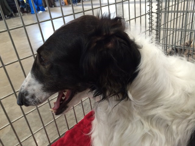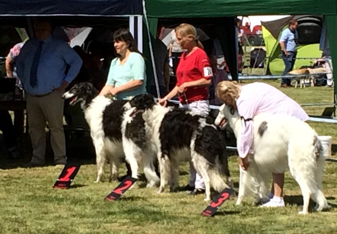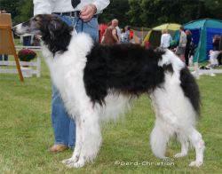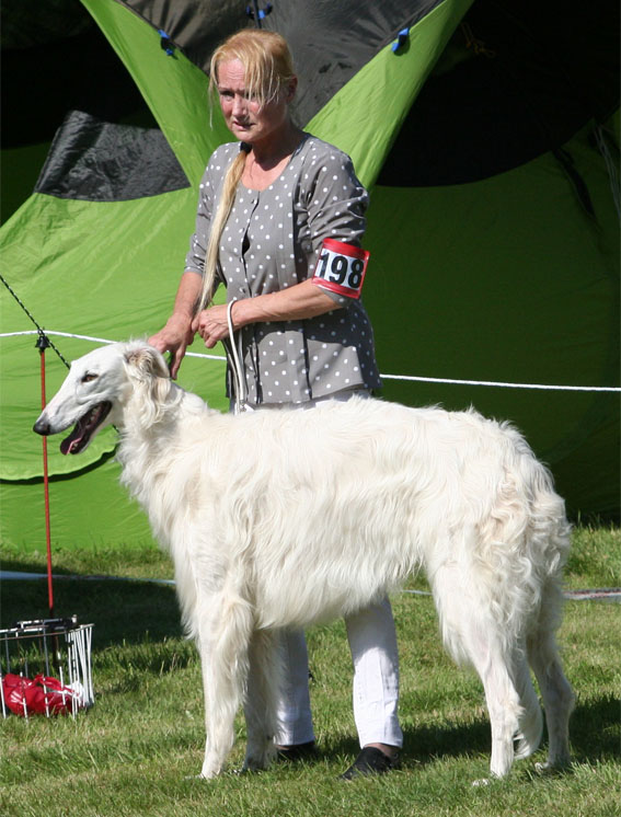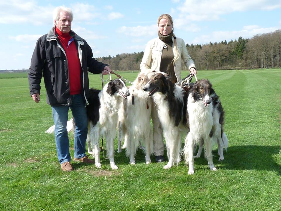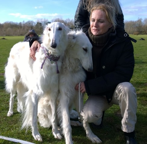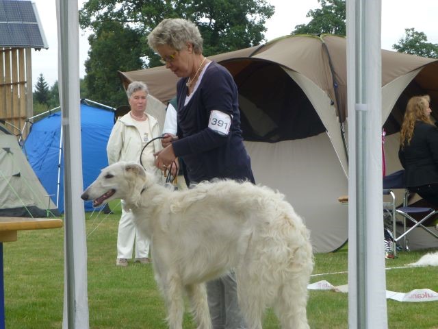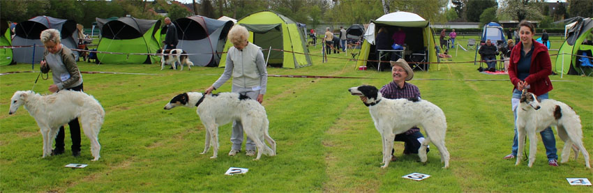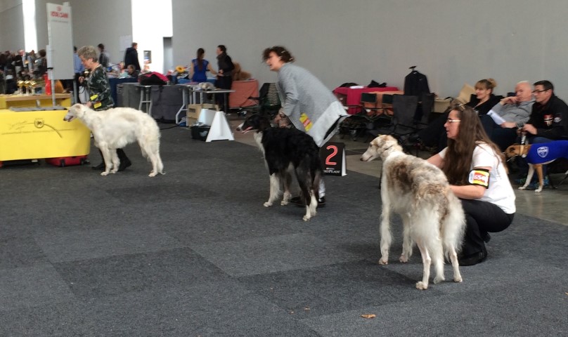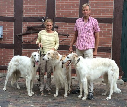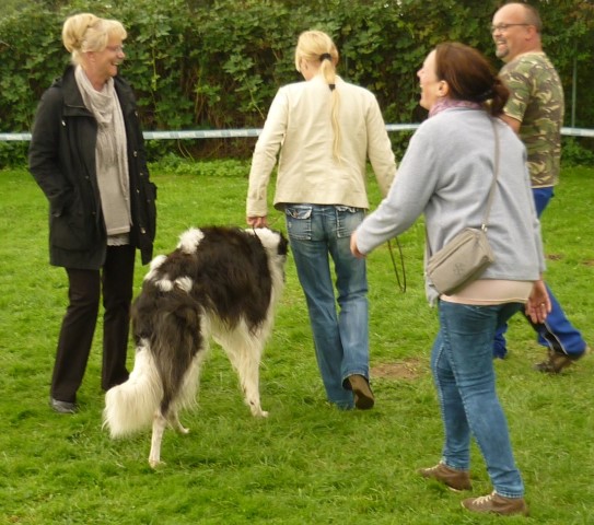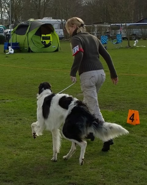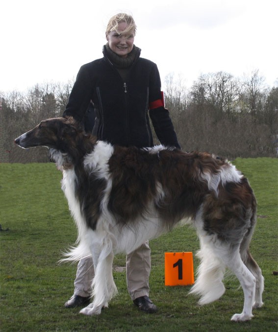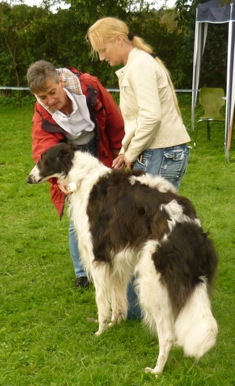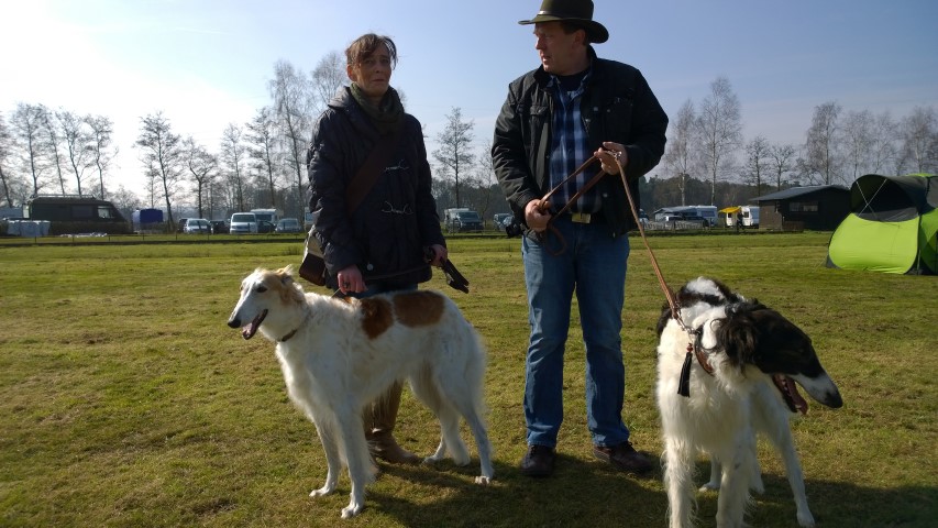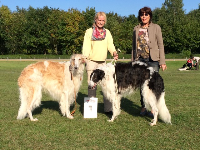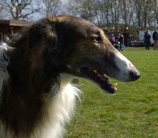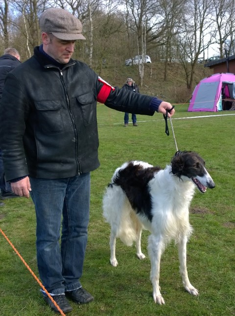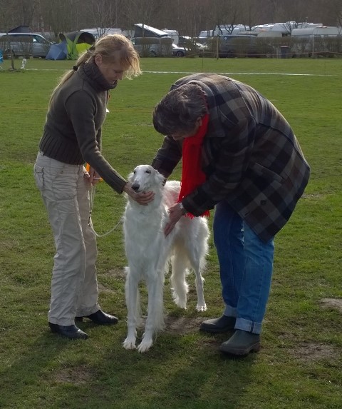 28.03.2015: Helle Aufregeung im Haus: Niemen hat mit voller Wucht das Schlafzimmertürgitter gerammt!!! Ich bekam einen Schlag auf die Achillessehne und konnte aber gerade noch verhindern, dass Katai von den umherfliegenden Trümmern erschlagen wurde! So hatten Niemen und ich schon mal unser Handicap im Freilaufen. Aber dann lief alles glatt, ohne Zeitdruck kamen wir in Ostercappeln an, das Wetter war traumhaft ( im Gegensatz zu gestern ) und alle Freunde waren da, wie versprochen, um auszustellen zu helfen. Dann fragt man sich: Wo ist der Pferdefuß? Den muß es doch geben! Und der bestand im Dualsystem. Amethyst gewann die Jüngstenklasse und holte sich auch später das Jüngsten-BOB, Opal bekam V2, Berendaij wurde mit V1 wieder erster und Niemen mit V2 zweiter, Olessia wurde bei den Hündinnen wieder erste und Olala mit V3 dritte ( Ausnahmen bestätigen bekanntlich die Regel ), Jakira Raschi-Pack-Buran kam in der Veteranenklasse wieder auf Platz 1. Und kaum waren die Barsois durch, schlug das Wetter um und aus Sonnenschein wurde Regen. Ich nahm meine Arbeit als Ringordner auf, fror, lernte viel über andere Rassen und am Ende des Tages waren wir alle glücklich und zufrieden, tranken Sekt und freuen uns schon auf das nächste Mal in dieser Runde.