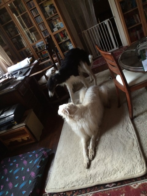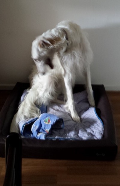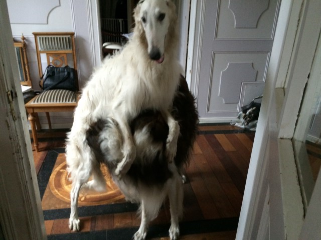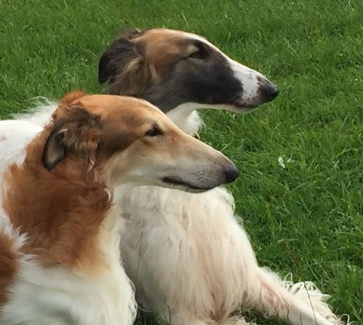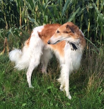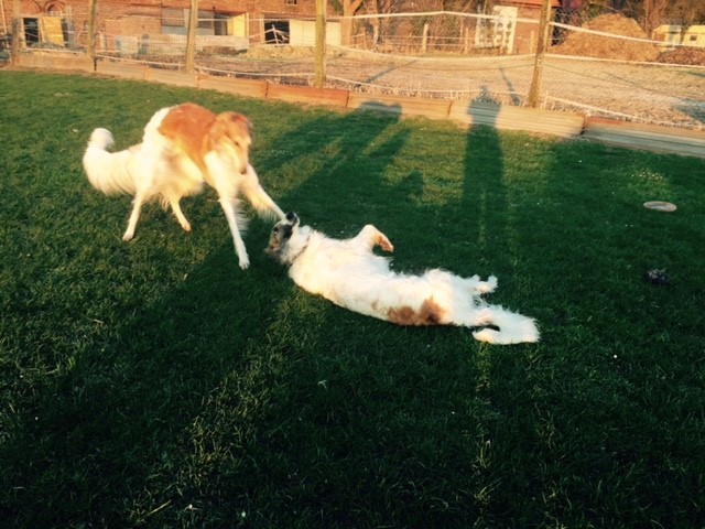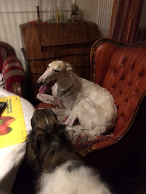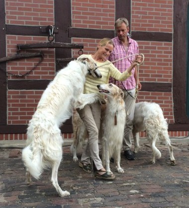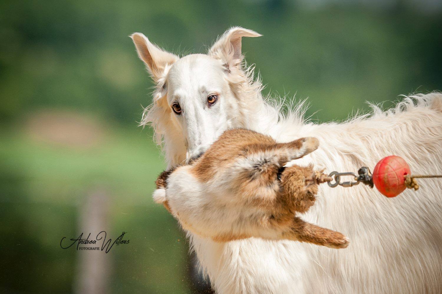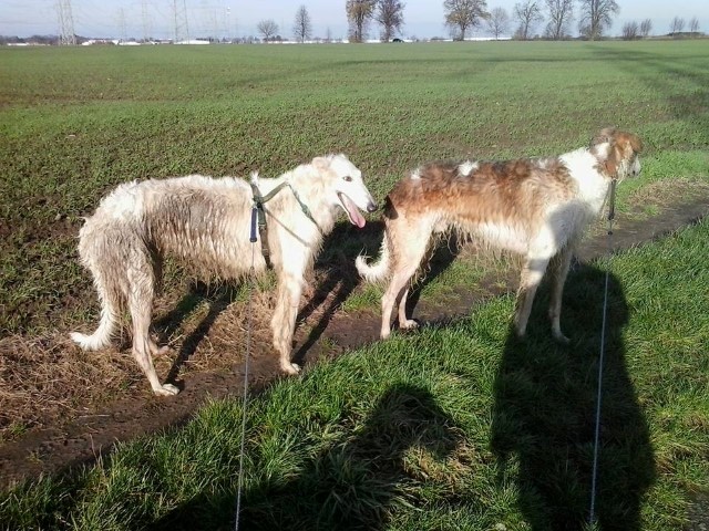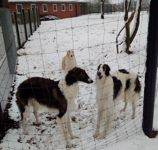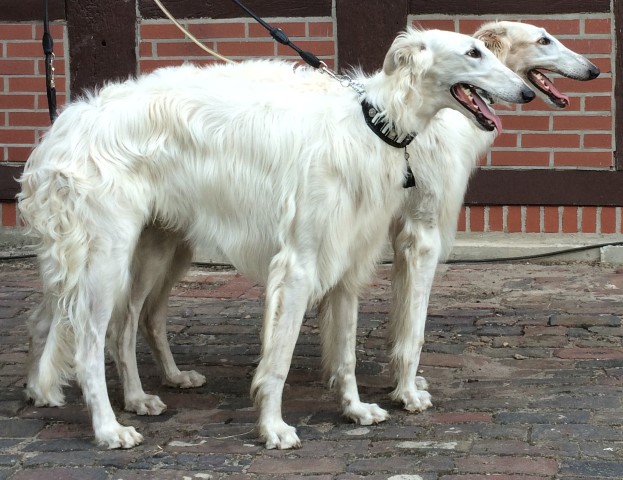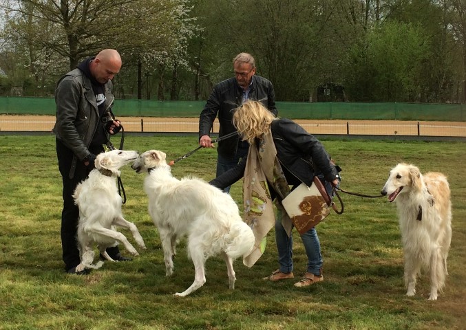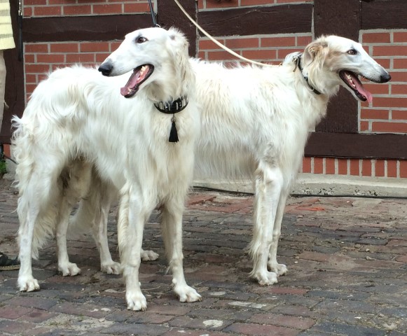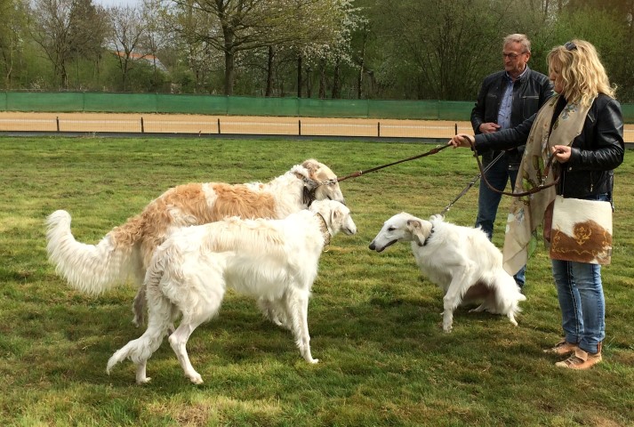 11.04.2015: Barsoijahresausstellung in Volkmarsen, ja, was soll ich dazu sagen: Nichts! Wir waren früh wieder zu Hause, denn mit 3 unplatzierten Vs brauchten wir ja auf nichts warten, doch irgentwie können wir ja froh sein, Vs bekommen zu haben, so, wie gerichtet wurde. So konnte ich noch ein wenig im Garten arbeiten, das war auch bitter nötig. Ich war auch nicht sonderlich überrascht über unser Abschneiden, denn schon in Dortmund hatte Herr Jackel Niemen und Opal schon keines Blickes gewürdigt. Somit war ich auch nur mit 3 Hunden da, und nicht, wie in Hoope, mit 7 Hunden am Start! Dabeisein war heute nur das Motto! Ich habe mich gefreut über das Wiedersehen mit Freunden und Aquamarin! Auch möchte ich allen Gewinnern und Platzierten von hier aus beglückwünschen! 07.04.2015: Volia freut sich und spielt mit Freunden.