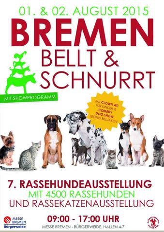 08.03.2015: Um 7:00 Uhr ist Karin da, wir "versiegeln" mit vielen Decken ihr Auto und dann die Hunde rein und los! Die Autobahn ist frei, wir haben sogar noch Zeit zu frühstücken und sind punktlich an der Trabrennbahn. Das Wetter ist toll! Jetzt wäre "draußen" schön, aber das geht nicht! Unser Ring wird von 3 Säulen unterteilt, eine Herausforderung für die Richterin. Christoph stellt den Amethyst aus, der nach seinem Bruder ein VV2 bekam und ich freue mich, das Aquamarin das VV1 und auch das Jüngsten-BOB bekommen hat! Unsere Edelsteine! Auch Alpha-Makawi war da, es ist eine Freude, die Süßen zusammen zu sehen! Leider konnten wir keine "Zuchtgruppe" melden, denn Makawi war ja nicht gemeldet, Und Niemen hat einen anderen "Nachnahmen"! Zusammen machten wir uns über den leckeren Kuchen, den Wilfried gebacken hatte, her! So verging die Zeit bis zur Richterberichtsausgabe sehr angenehm. Opal hat das Res-CAC/Res-VDH bekommen! Und Niemen bekam das V1, VDH in der Champion-Klasse, wurde bester Rüde und errang auch das BOB! Doch dann zog es sich hin, bie endlich der Ehrenring begann! Im Ehrenrieg wurde Niemen noch zu den 4 Besten ausgesucht! Um 18:30 Uhr konnten wir endlich los! Karin war nicht glücklich, weil sich zum Schluß alles unendlich lang hinzog, wir hatten ja noch eine gute Strecken zu fahren, ich danke ihr ganz herzlich für ihre Hilfe.