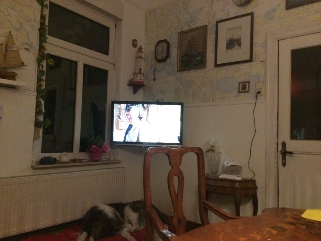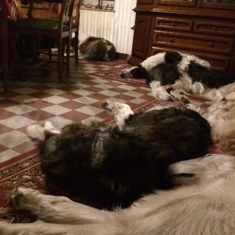 26.04.2015: So sehen bei uns die Abende aus: Opal, Odaloij und Amethyst liegen, Niemen bereitet den Platzwechsel vor und dann: Alles liegt fast wie vorher! Ein harmonisches Miteinander! Dann: Amethyst, Odaloij. Niemen, Opal vor Katai, hinten liegt Nabat, Berendaij schläft im Büro! Und Frauchen sieht derweil fern, telefoniert oder arbeitet am PC.