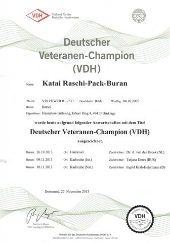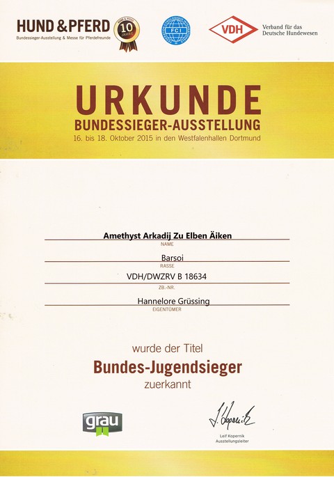 27.05.2015: Die 2.Urkunde ist jetzt auch da, jetzt ist es amtlich: Berendaij ist Dt. Champion VDH & DWZRV und wurde auch noch VDH-Frühjahrssieger 2015: