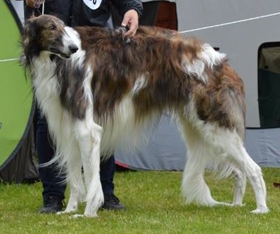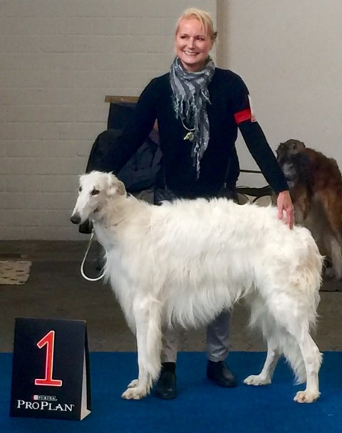 Heute waren wir nicht so gut in Form, allen steckte der gestrige Tag noch in den Knochen und wir hätten fast verschlafen! Dennoch reichte es für 2 erste Plätze und für Opal zum Res. CAC und für einen 2. Platz! Das alles bedeutet für Opal, dass er mit 16 Monaten schon in der "Warteschleife" für das VDH-Championat ist! Unser "Edelsteinchen" hatte zum ersten Mal in seinem kurzen Leben einen Auftritt unter strenger richterlicher Aufsicht und wurde für VV1 befunden, wäre er denn schon in der Jüngstenklasse, doch mit 4 Monaten..... ! Zumindest hat er schon mal "Hallenerfahrung" sammeln können und ist bislang unser coolster Junghund, mit dem wir je auf einer Hallenausstellung waren! 17.01.2015: Unsere erste Ausstellung in diesem neuen Jahr, und das schon im Januar! Aber Münster ist nicht so sehr weit. Unser kleiner "Edelstein" Amethyst mußte auch mit, er kann ja nicht den ganzen Tag alleine bei den zu Haus gebliebenen Großen bleiben! So fahren wir mit 4 Barsois in die Münsterlandhalle. Unser Kleiner benahm sich wie ein Großer: Ganz suverän durchschritt er die Hallen mit den Verkaufsständen und ging wie am Schnürchen an allen anderen Hunden vorbei! Da wir früh da waren, konnte ich auch kurz mit ihm in den Ring, und auch das machte er cool! Ich freute mich, viele Bekannte zu treffen, se war ein schöner Tag ( trotz Halle und trotzdem, dass die DWZRV-Ringe alle als einzige ohne Teppig waren! Es war sehr glatt! ) Opal gewann die Zwischenklasse mit V1 und auch das Stechen um das CAC, Niemen bekam sein V1, VDH in der Championklasse und wurde bester Rüde und auch Berendaij gewann die offene Klasse mit V1, VDH. Wir haben uns sehr über Opals erstes CAC gefreut! Aber natürlich auch über unsere anderen! Ganz lieben Dank an Claudia und Christoph!
