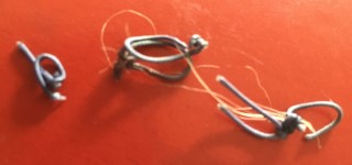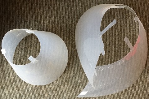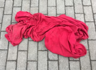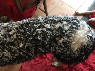 Zuerst habe ich mühevoll die Tüte verschmalert, also die Breite gekürzt und neue Schlaufenlöcher geschnitten, damit ich sie zusammenstecken konnte. In der Originalgröße würde er kaum durch die Tür passen. Und da sitzt er nun, und schaut mich vorwurfsvoll an! Doch ich kann ja auch nichts dafür! Doch dann geschah ein kleines Wunder: Unangekündigt kam die bestellte Kragenscheibe!