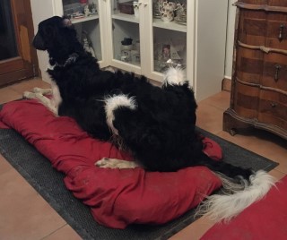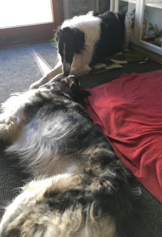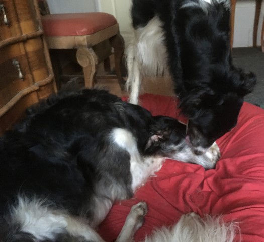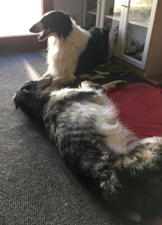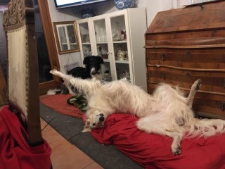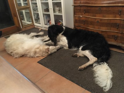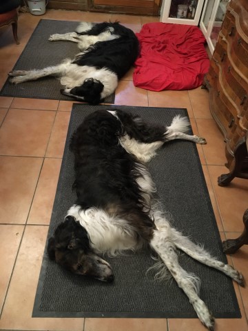 26.12.2021: Ein bißchen wurde noch "gebastelt", doch dann genossen wir den Tag auf dem Sofa. Das Wetter war grau, am Nachmittag begann es etwas zu regnen, also: Wir verpaßten nichts. Die Barsois jedoch wollten - wie immer, und jetzt besonders - raus und rein. Natürlich kamen sie mit dreckigen Füßen! Was das für uns bedeutet, das weiß jeder "Mehrhundehalter"!