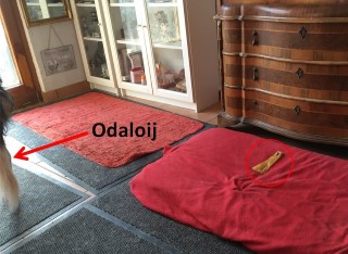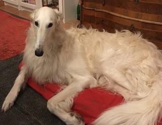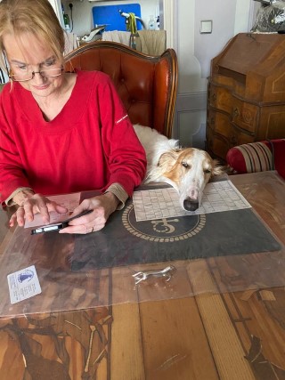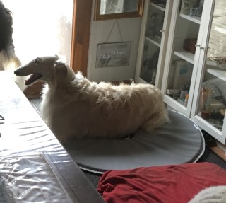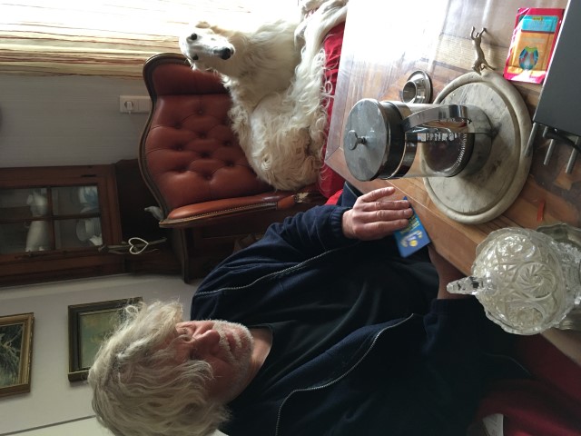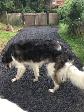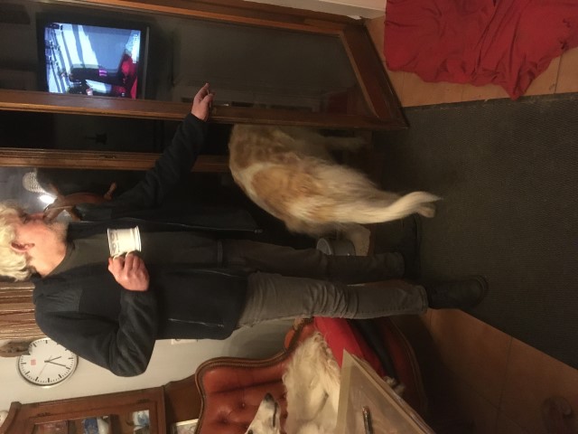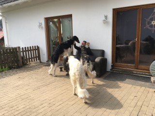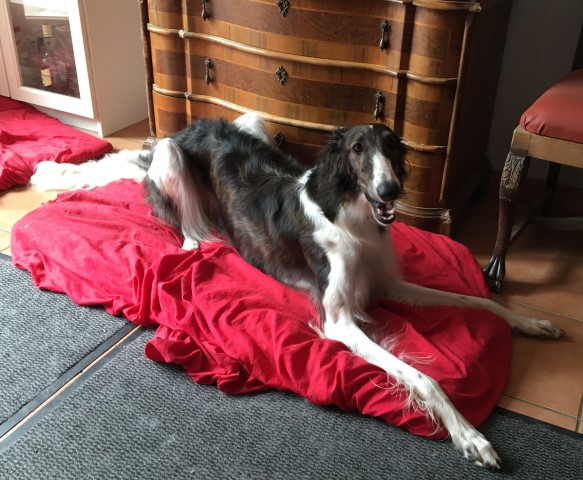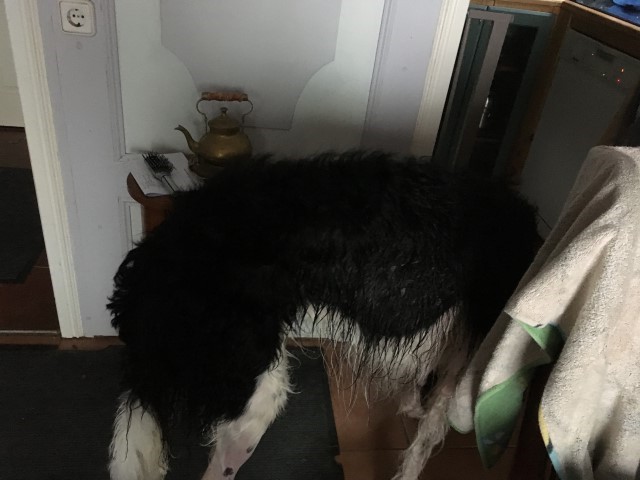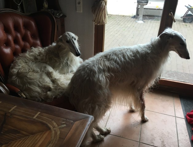 Ist ja gut, ich stehe ja schon auf, laß Makawi raus und geh ins Wohnzimmer! Und ich habe es tatsächlich geschafft, dass alles sauber blieb, bis er wieder kam! Huch, die Barsois hatten es damit nicht leicht, ich auch nicht, bei dem Dreckswetter immer Füße abwischen!