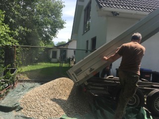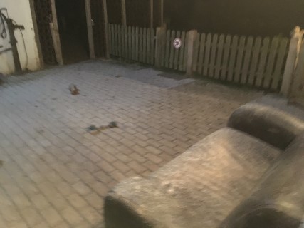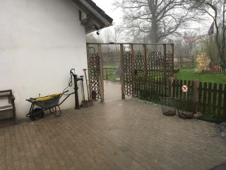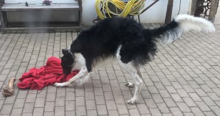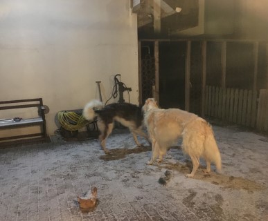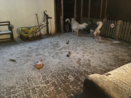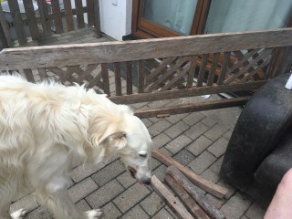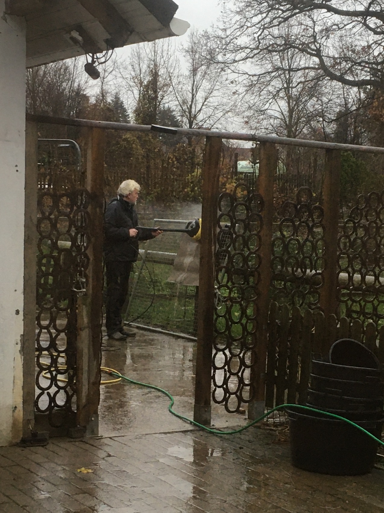 20.01.2021: Achim säubert die Hundematten mit dem Hochdruckreiniger, und die dunkle Familie schaut interessiert zu!