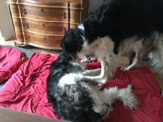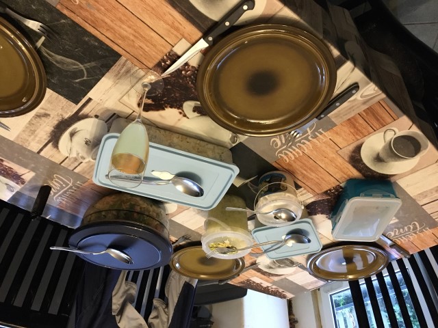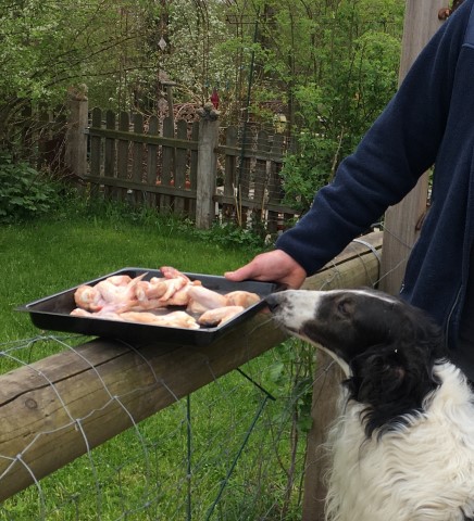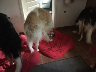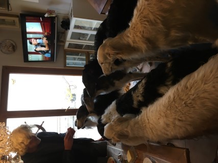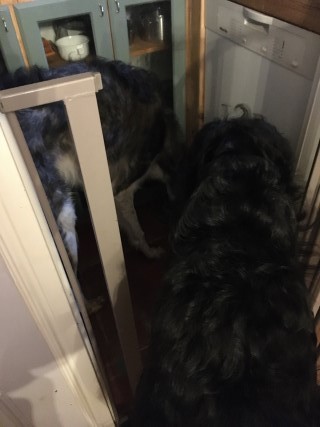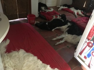 Achim ist aus der Stadt zurück, 7 Barsois in der Küche. Um den Tisch decken zu können, bilden die Lieben eine "Rettungsgasse", sonst wäre ein Transfer zwischen Tisch und Kühlschrank nicht möglich!