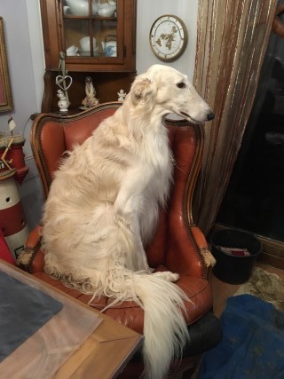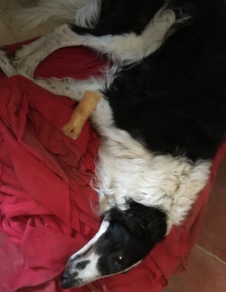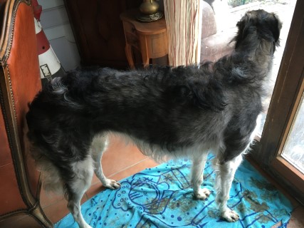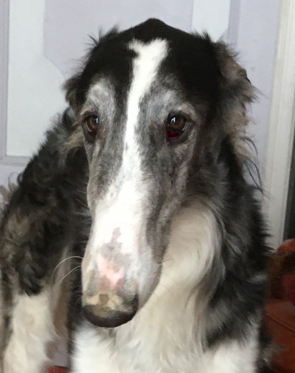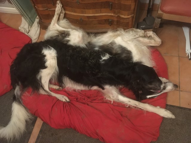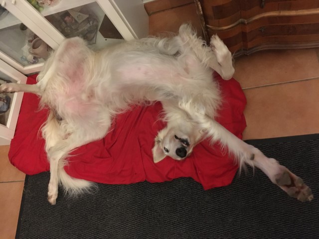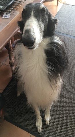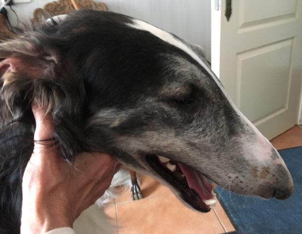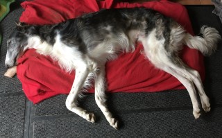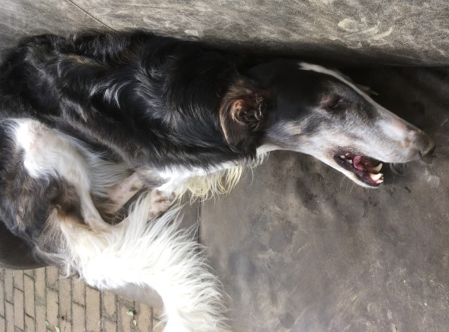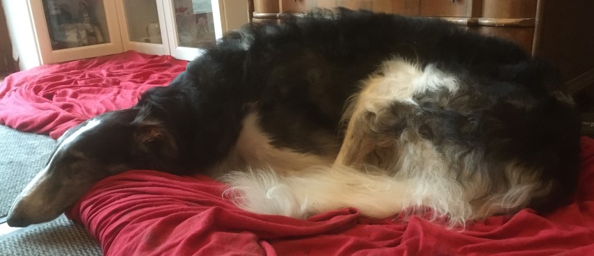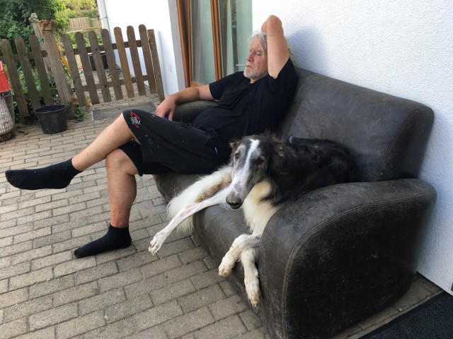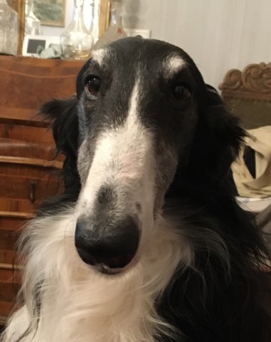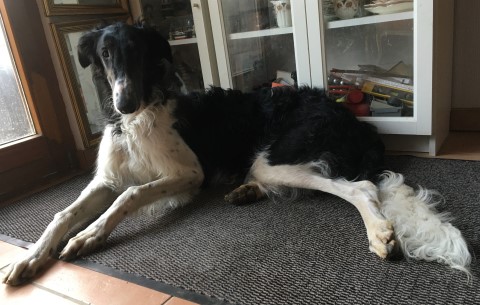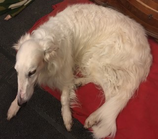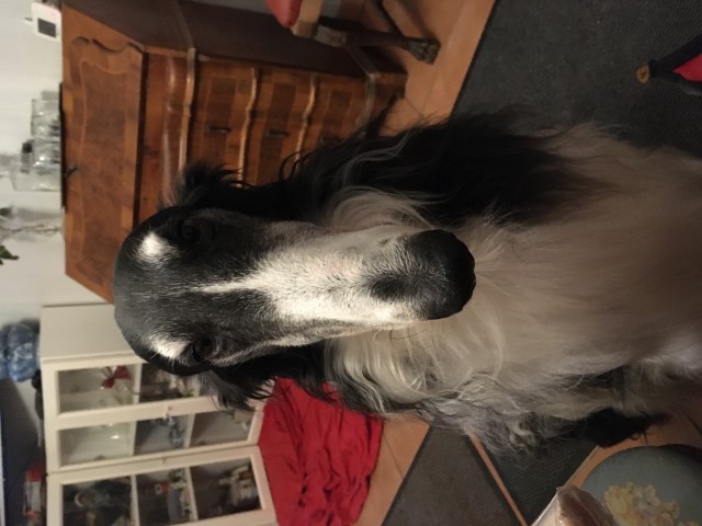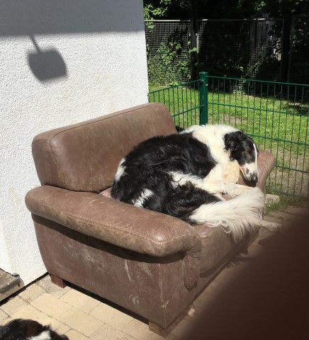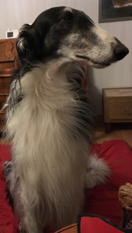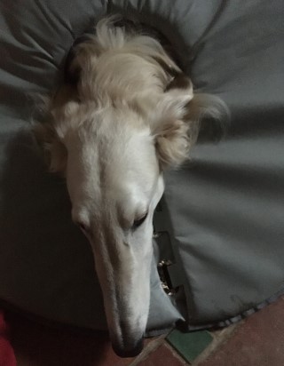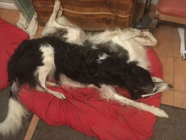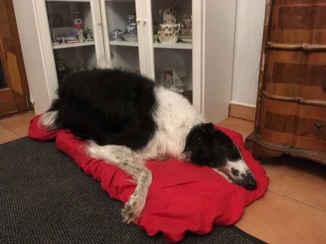 Amethyst Arkadij zu Elben Äiken,03.09.2014, B 18634, Band XLVISighthound of the Year 2017 in Schönheit und Leistung Dt. Champion Schönheit & Leistung, Dt .Champion VDH, Dt. Champion DWZRV, Dt. Jugend-Champion DWZRV, Dt. Jugend-Champion VDH, DWZRV Coursing-Champion, LU-C, CACIL-Prüfung Verbandssieger 2019, Landessieger Niedersachsen-Sachsen-Anhalt 2019, DWZRV-Sieger 2018, DWZRV-Sieger S&L 2018, Anniversary Winner Donaueschingen 2018, Landessieger NRW 2018, Landessieger Weser-Ems 2018, DWZRV-Sieger Schönheit&Leistung 2018, German-Winner 2016, Alpensieger 2016, ( Sieger Baden-Württemberg 2016, Sieger Karlsruhe 2016), Landesjugendsieger Weser-Ems 2015, Landesjugendsieger NRW 2015, Bundesjugendsieger 2015, Q. f. crufts 2016, Wellhaar, weiß, DM-frei, DCM-frei Körung am 04.07.2016, Prädikatskörung für Schönheit und Leistung am 22.11.2016 Amethyst hat die Leistungsurkunde Coursing und die CACIL-Prüfung, die ihn berechtigen, in der Gebrauchshundeklasse zu starten. 3 CACIBs, Ranglistengewinner Schönheit 2016, Ranglistengewinner Coursing 2017 V1, VDH, CAC, Bester Rüde, Anniversary Winner Donaueschingen 2018, aus der Gebrauchshundeklasse heraus! Ich habe es ja gesagt, die Seite ist voll, und das bei "kleiner" Schrift! Hoffentlich ist Amethyst jetzt zufrieden. Außerdem haben wir unsere Kübelpflanzen "aufgestallt", sie überwintern im Welpenzimmer, wie jedes Jahr. Und dann noch ein Foto von der langen Nase von Knjas. So kann man auch liegen.