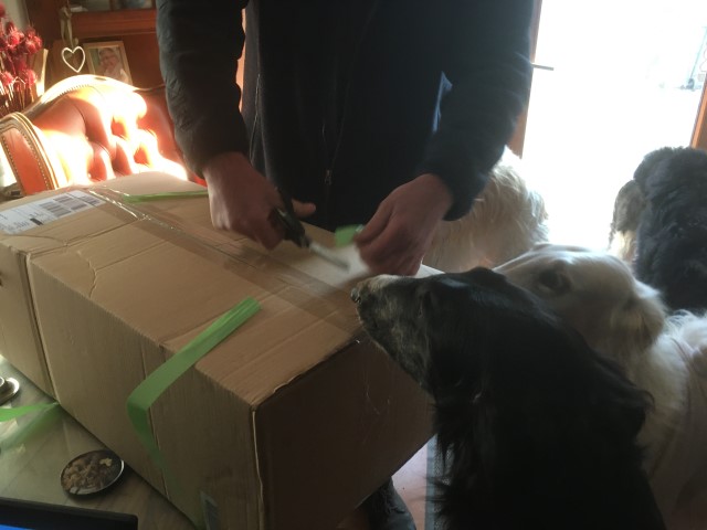 Die 4-beinige Familie kann es kaum erwarten, bis endlich eine Tüte geöffnet ist! Danke, liebe Karen! Die Lieben sind sehr, sehr glücklich! Ja, und dann kam auch noch der "Mann für`s Solar"! Mal seh`n! Nee, war wohl doch nicht so interessant, hat auch nichts Leckeres dabei!