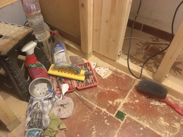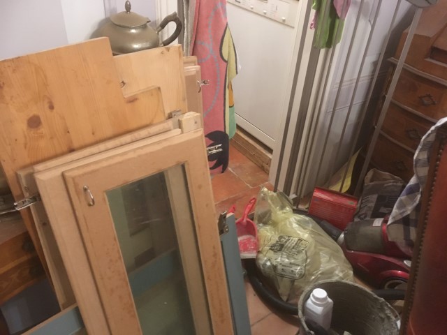 Die ausgeräumte Küche, das volle Wohnzimmer, die von mir abgebeizten Schranktüren und Böden ( Schittarbeit! Meine armen Fingernägel!!!)