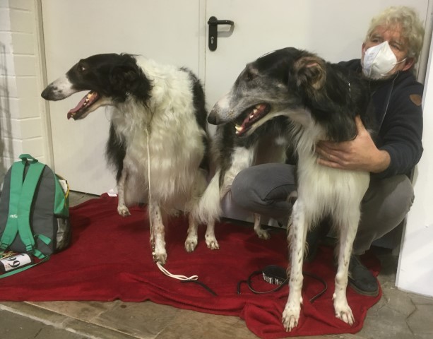 04.12.2021: Früh klingelte mein Wecker, ein Blick zur Seite zeigte mir, Achim war schon auf. Er saß gut gelaunt in der Küche, Tasse Kaffee, hatte die Barsois schon rausgelassen und war eigentlich abfahrbereit. Ich hingegen brauchte noch eine gute Stunde. Die längste Zeit nahm das Aussuchen und Anziehen in Anspruch, Weiberkram eben. Unter gehörigem Abschiedsgeheule fuhren Achim, Opal, Beryll und ich nach Kassel. Sonst bin ich immer total aufgeregt, heute war ich die Ruhe selbst! Ob es am Stoßgebet und der Kerze im Dom lag? Vielleicht, vielleicht aber auch, weil ich mir nichts ausrechnete! Opal war immer noch zu dick, und Beryll hatte immer noch kaum Schmuckhaar! Doch für Beryll war diese CACIB so unendlich wichtig, er braucht ja eine SG-Bewertung für die FCI-CACIL-Lizenz! Und trotzdem war ich ganz ruhig. Viel hatten wir nicht mehr üben können, denn es war nur noch Matsch und naß im Paddock. Als wir ankamen, sahen wir schon die KM-lange Schlange (n), die sich zum Einlaß drängten. Wir waren jedoch früh genug. Dennoch verzögerte sich der Richtbeginn um ca eine 3/4 Stunde, bis alle Gemeldeten endlich an unserem Ring waren.
