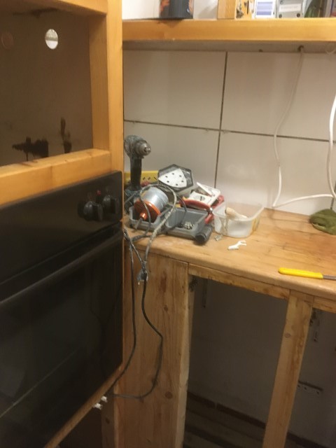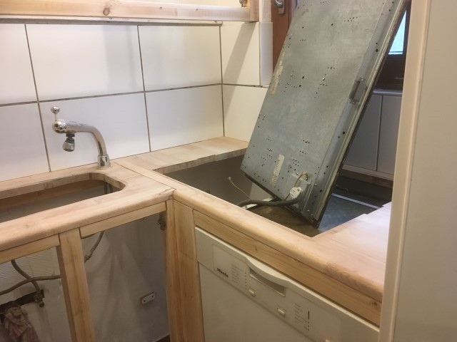 Die Fliesen sind dran, müssen noch verfugt werden. Doch zuvor muß die Arbeitsplatte noch geschliffen werden, auch das andere "Holz", viel Arbeit!