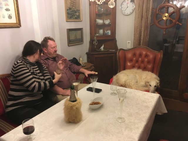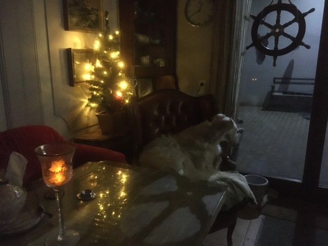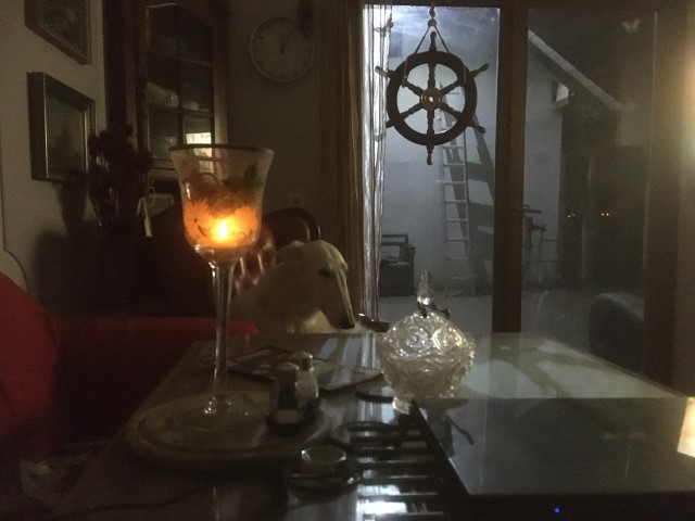Bis die Barsois noch ein letztes mal raus mußten, hatte ich es mir gestern abend noch richtig gemüdlich gemacht in der Küche mit Kerze auf den Tisch, Teelichter in Gläschen und einem heißen Kakao, Achim schlief schon. Dann, nach 24:00 Uhr die Barsois raus, wieder rein, schlafen gehen.