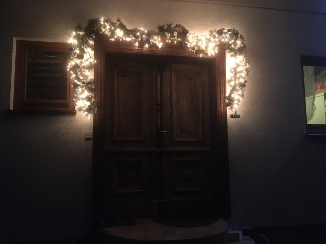 13.12.2021: Achim hat heute die Weihnachtsgirlande über unserer Haustür an das Stromnetz angeschlossen. Erstmalig nach 8 Jahren leuchtet sie für uns! Sie ist ein Geschenk einer unserer Nachbarn aus Dinklage. Dort konnten wir sie nicht aufhängen, doch jetzt in Soest erstrahlt sie in der Dunkelheit. Ich freue mich sehr darüber!