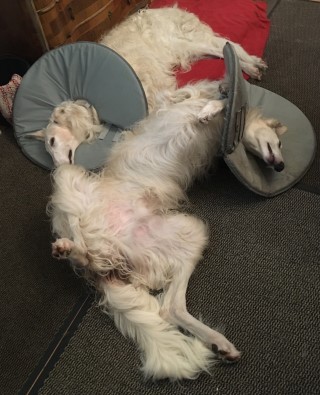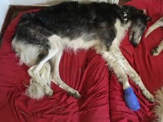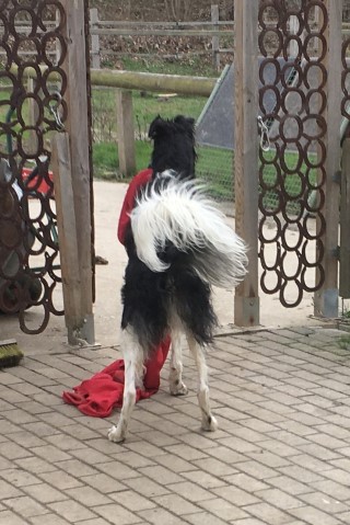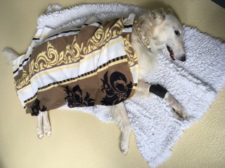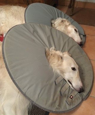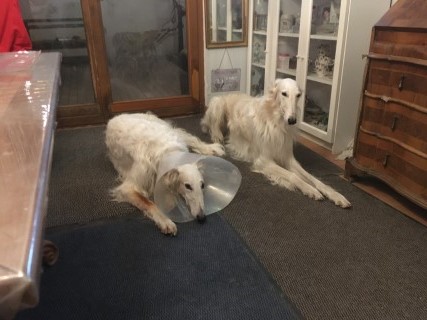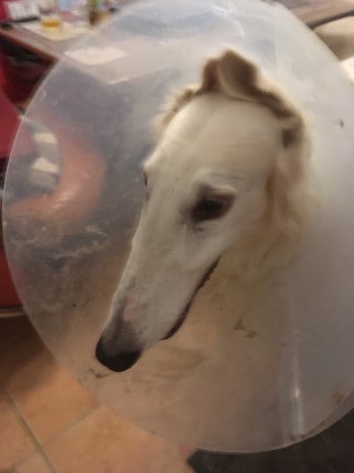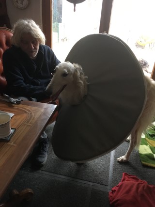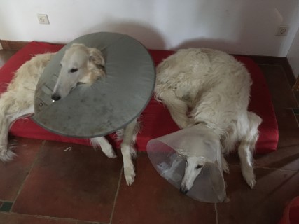 17.02.2021: Heute liegt kaum noch Schnee! So schnell, wie er kam, ist er auch wieder geschmolzen. Und ich habe Brilliant die Fäden gezogen. Allerdings muß er seine Tüte noch echt lange tragen. Nun ist er ein "Depri-Barsoi"! Kann ich gut verstehen.