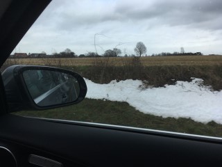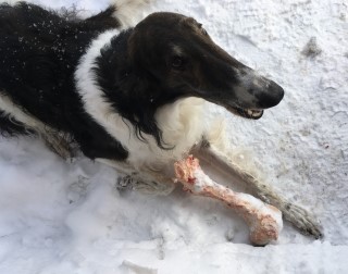Bei der Einkaufsfahrt entdeckte ich tatsächlich Schnee! Ich mußte leider einkaufen, denn unsere Barsois und wir müssen dringend auf Diät! Also wird "Lightfutter" gekauft. Und was passiert: Sie futterten ihre Näpfe gar nicht erst leer! Schmeckt wohl nicht! Na, so kann Hund auch wieder schlank werden.