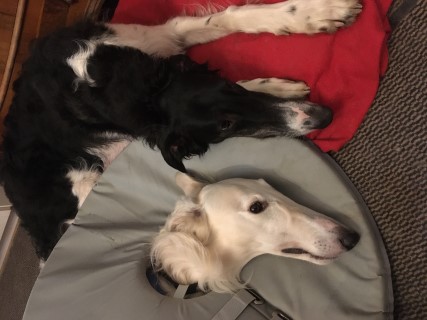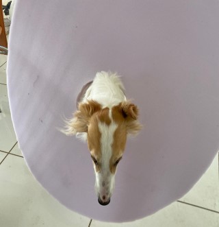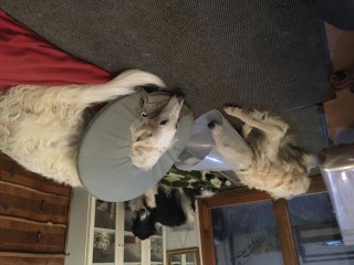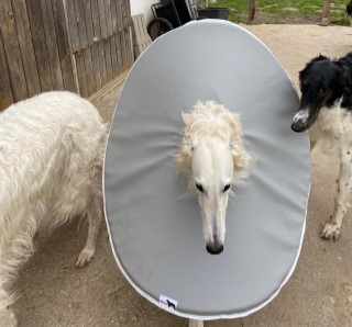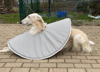 03.02.2021: Gestern wurde Brilliant in Dinklage operiert! Er hat bislang alles gut überstanden, hat guten Hunger und genießt die extrem hohe Aufmerksamkeit, die er bekommt. Da er einen sehr langen schmalen Kopf und einen recht langen Hals hat, paßten die handelsüblichen "Tüten" nicht. Somit gab es für ihn eine extra lange, auch hatten wir vorsorglich einen ganz großen Schutzkragen bestellt.
